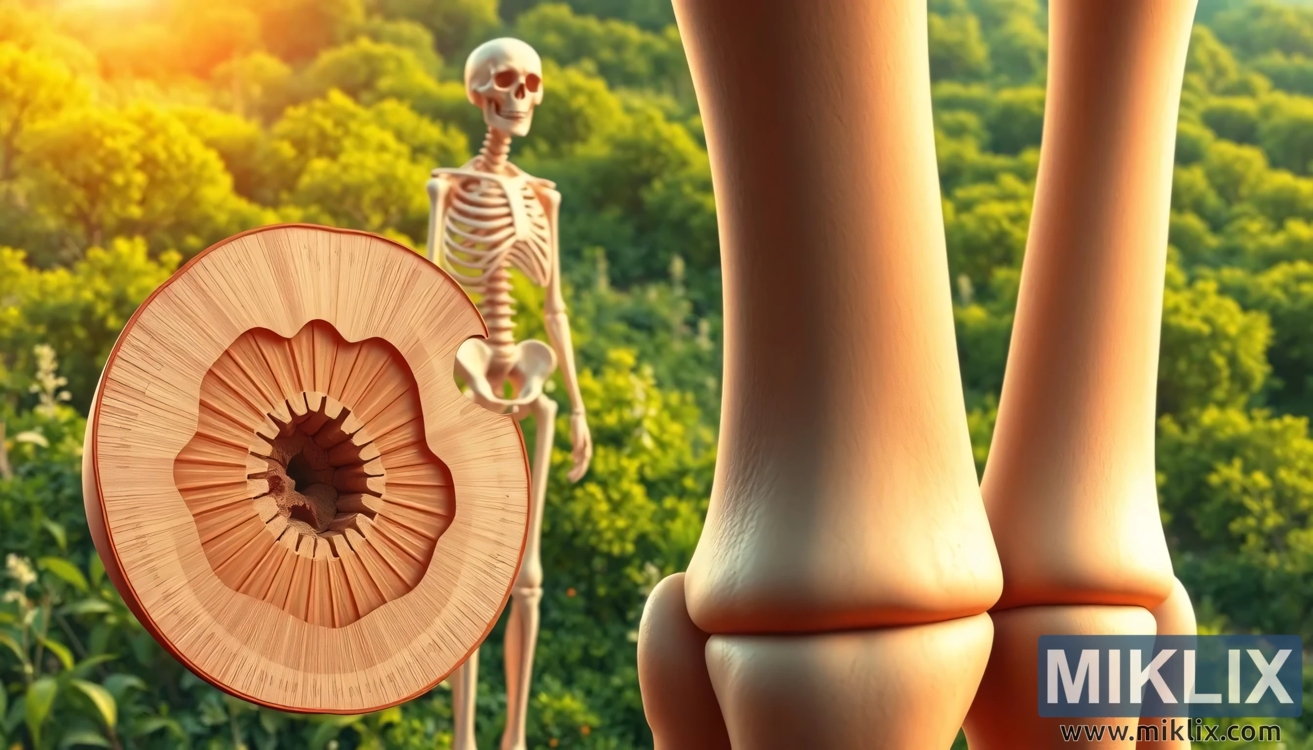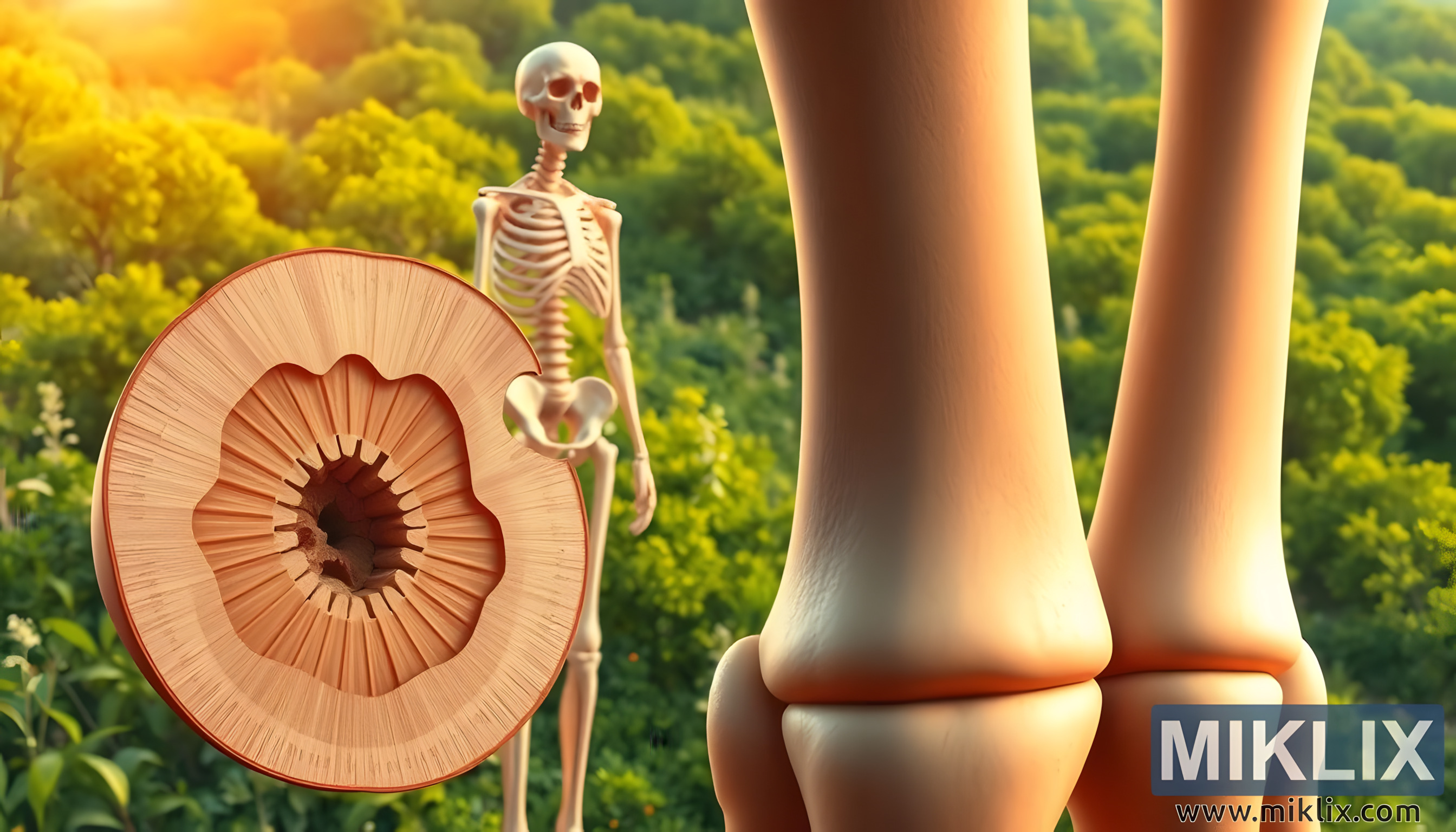 ამ ანატომიური ფოკუსის უკან მწვანე საფარის აყვავებული სივრცე იმალება, რომელიც ჰორიზონტამდეა გადაჭიმული, სავსე მზის სხივებით გაჟღენთილი ხეებით. ფოთლებში გაჟღენთილი ოქროსფერი სხივებით შერბილებული ფონი ბუნებრივ კონტექსტს ქმნის, რომელიც ვიზუალურ გზავნილს ამდიდრებს: ძვლების ჯანმრთელობა იზოლირებული ფენომენი არ არის, არამედ ღრმად არის გადაჯაჭვული ბუნების მიერ შემოთავაზებულ კვებასა და სიცოცხლისუნარიანობასთან. ძვლების მკვრივ სიმტკიცესა და ტყის რბილ, ცოცხალ ვიბრაციას შორის ურთიერთქმედება ჰარმონიის ძლიერ განცდას გადმოსცემს, რაც იმაზე მიუთითებს, რომ სხეულის ჯანმრთელობას ბუნებრივი სამყაროს სიუხვე უზრუნველყოფს.