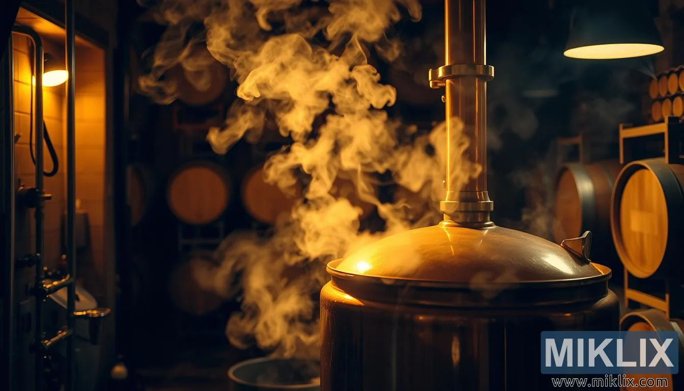 მყუდრო ლუდსახარშის სცენა, სადაც სპილენძის ქვაბიდან ყავისფერი ალაოს ნახარში ორთქლდება, თბილი ოქროსფერი შუქი და მუხის კასრები ტრადიციასა და ხელოსნურ ხელოვნებას გვახსენებს.