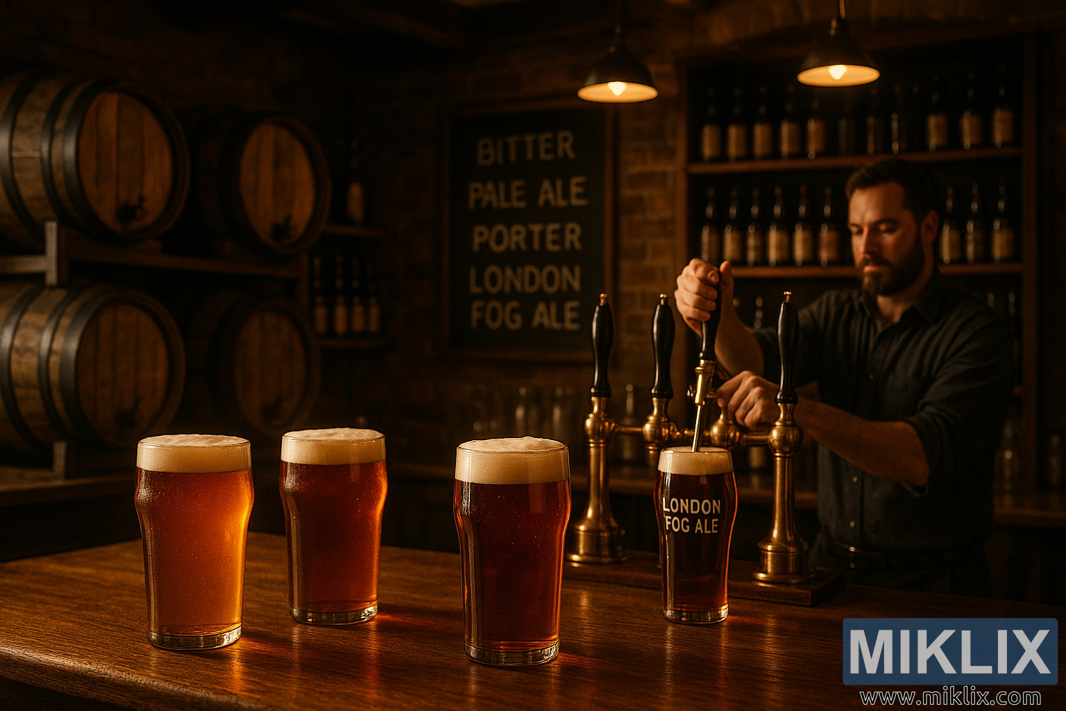 თბილად განათებული ლუდის დარბაზი, სადაც კლასიკური ბრიტანული ლუდია წარმოდგენილი, ბარმენი, რომელიც ლონდონურ ნისლიან ლუდს ასხამს და რუსტიკული დეკორი, მათ შორის კასრები, ბოთლები და აგურის კედლები.