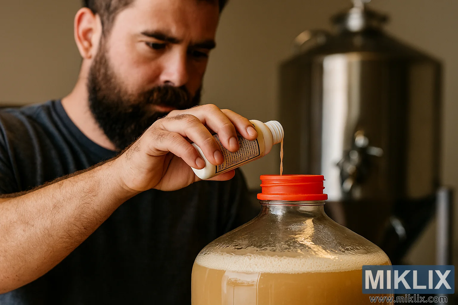 საფუარი თხელი, თანაბარი ნაკადით მიედინება ბოთლის ვიწრო ნაპრალიდან დიდი შუშის ვაგონის ფართო ყელში. ბოთლის ეტიკეტზე შავი ტექსტია კრემისფერ ფონზე, ოდნავ ფოკუსირებული, რაც კომერციული საფუარის შტამზე მიუთითებს. ვაგონი, რომელიც ჩარჩოს მარჯვენა მხარეს იკავებს, სავსეა მღვრიე, კრემისფერი ნახარშით, რომელიც მისი სიმაღლის დაახლოებით სამ მეოთხედს აღწევს. სითხეზე ქაფის ფენა დევს, რაც აქტიურ დუღილს მიუთითებს. ვაგონის წითელი ხრახნიანი თავსახური მოხსნილია, რაც აჩენს ღია ყელს, სადაც საფუარი ემატება. მინის ზედაპირი ოდნავ დაბინდულია კონდენსაციით, რაც სცენას რეალიზმს და ტექსტურას სძენს.