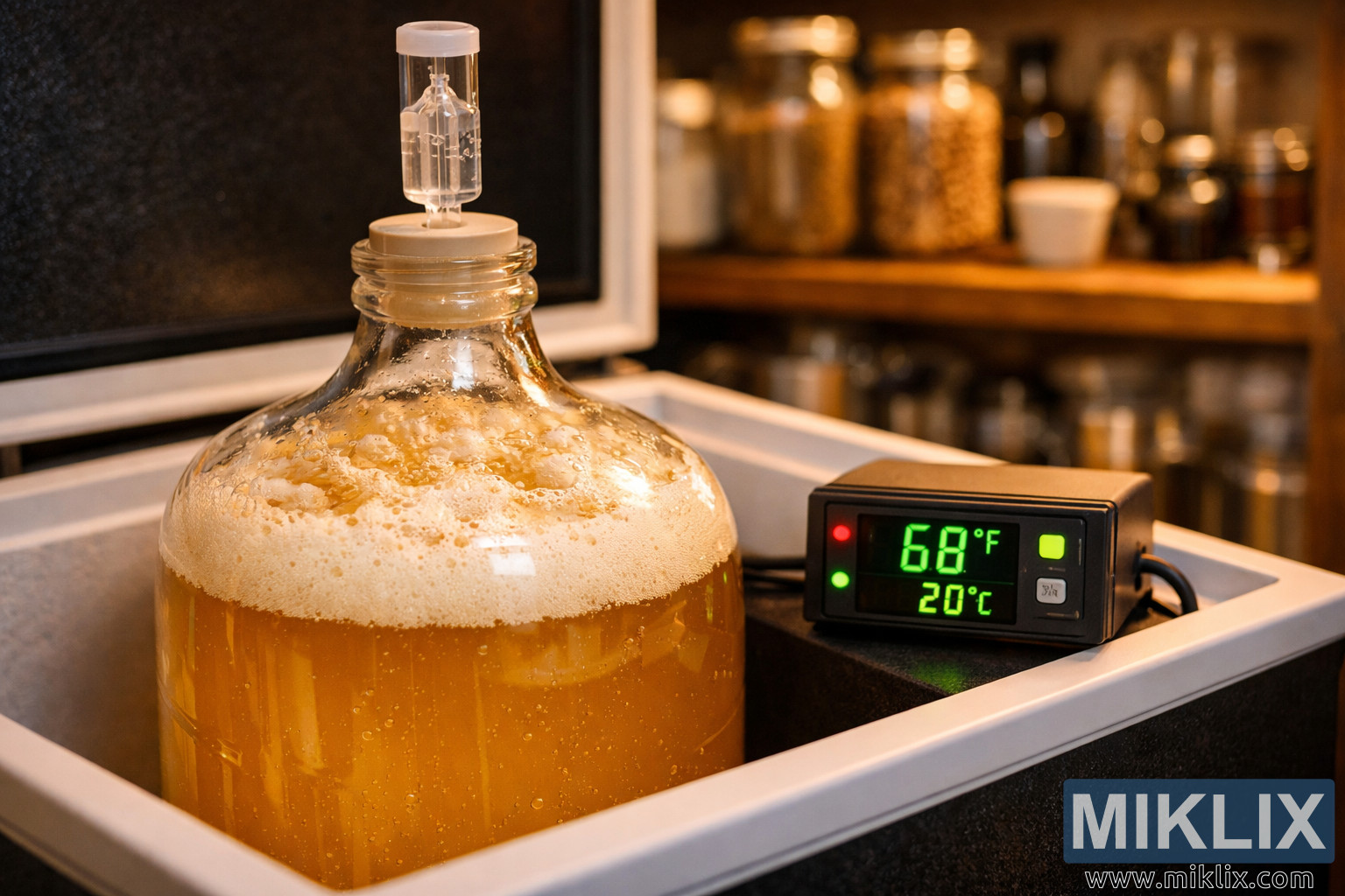 სახლში დამზადებული ლუდის დუღილის თბილი და დეტალური ხედი, რომელშიც წარმოდგენილია ღია ფერის ლუდის შუშის კარბოი, აქტიური დუღილი და 68°F-ზე დაყენებული ციფრული ტემპერატურის კონტროლერი, რაც იდეალურია ჩრდილო-დასავლეთ ლუდის საფუარისთვის.