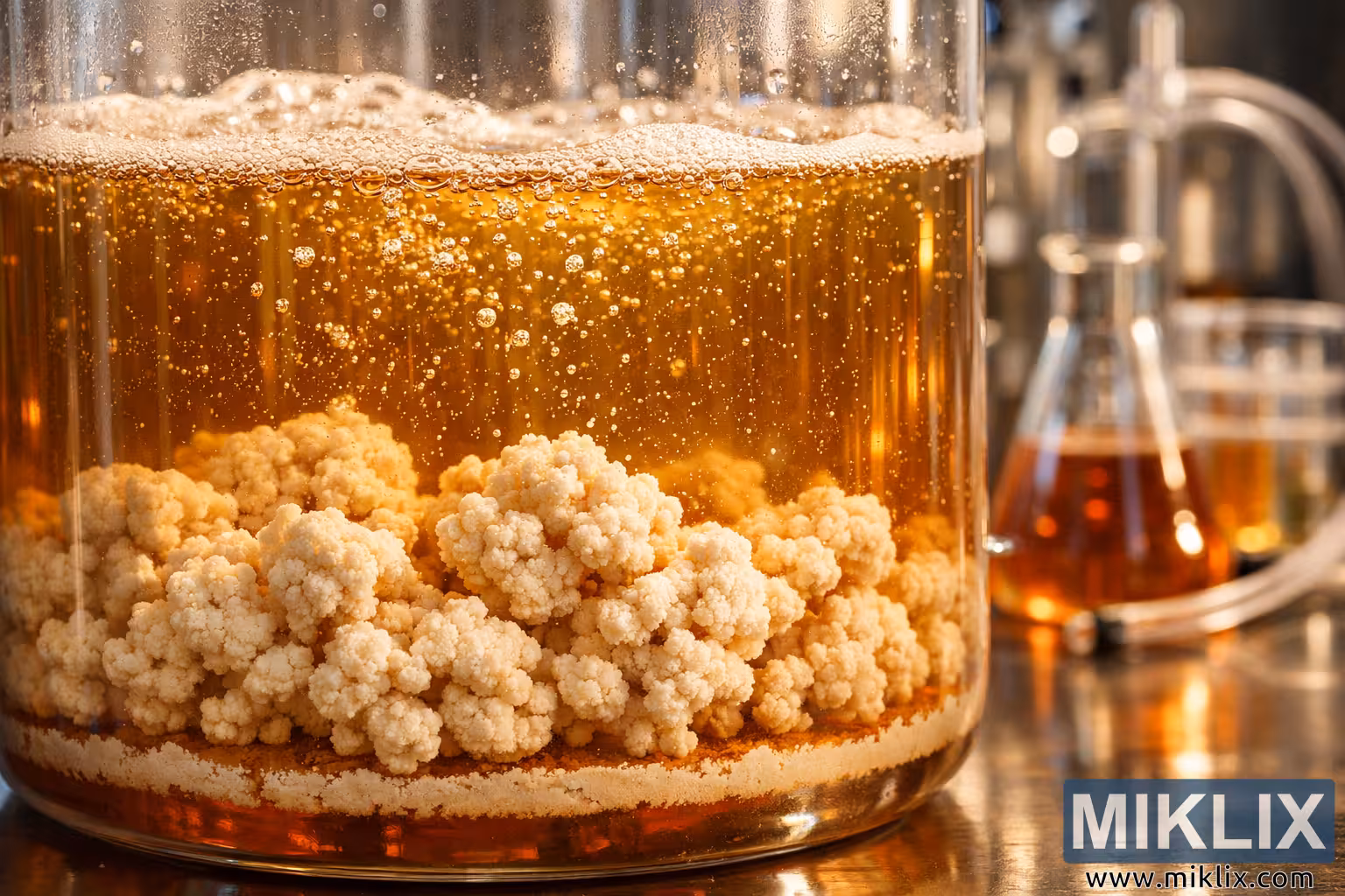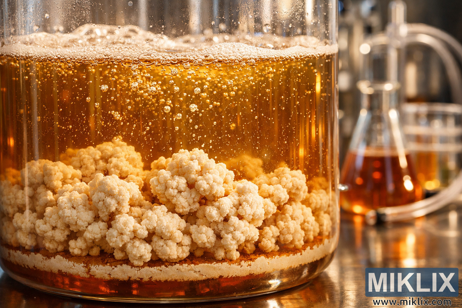 ლუდის დუღილის დროს საფუარის ფლოკულაციის მხატვრული, მაღალი გარჩევადობის გამოსახულება, რომელიც ხაზს უსვამს კრემისებრ საფუარის კლასტერებს, გამჭვირვალე ქარვისფერ სითხეს და ლაბორატორიული ლუდის მოხარშვის სუფთა გარემოს.