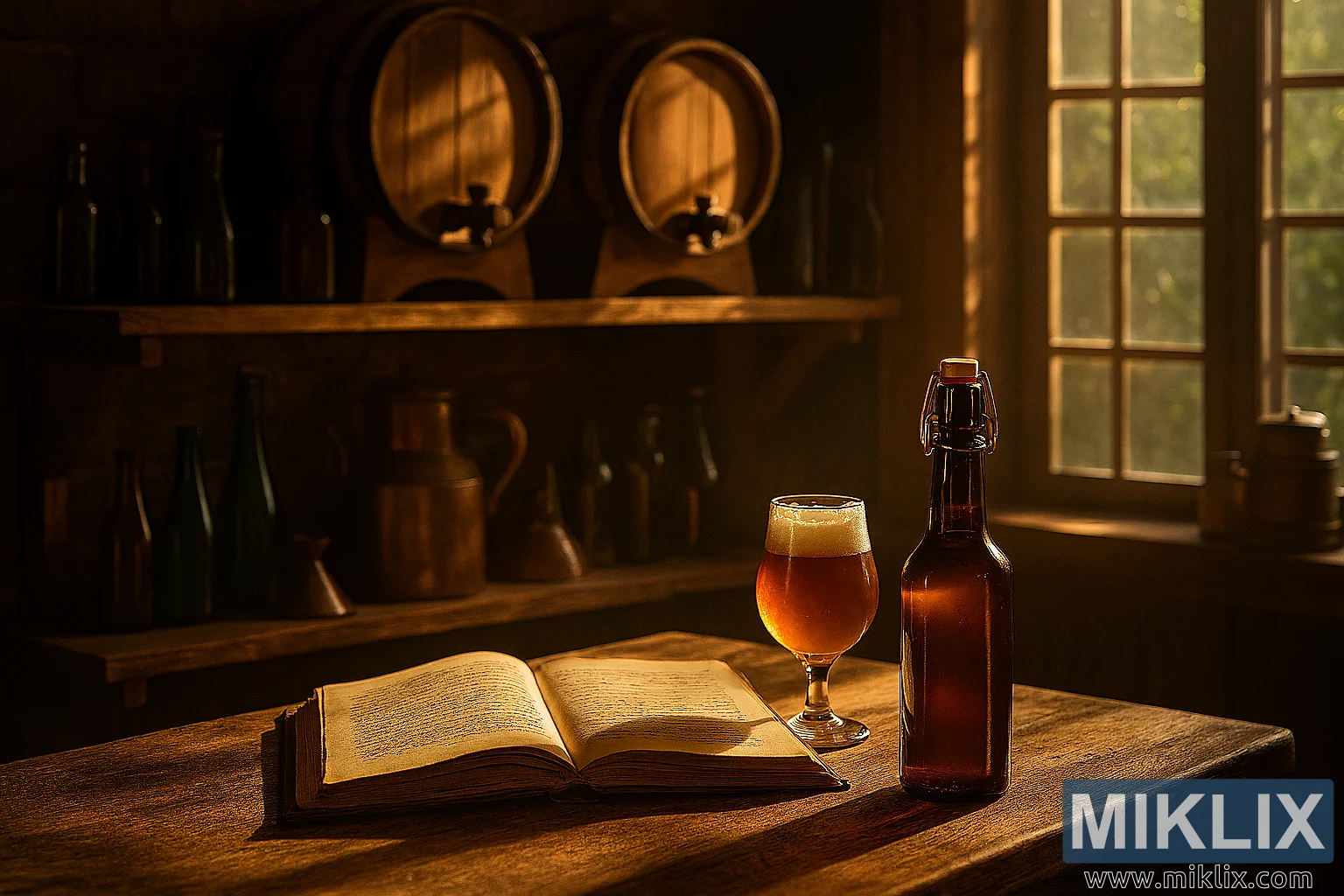 თბილი, მზის სხივებით განათებული ლუდსახარშის ინტერიერი, სადაც წარმოდგენილია ხელოსნური ლუდის დამზადების აღჭურვილობა, ხის კასრები და რუსტიკული მაგიდა ღია წიგნითა და ფრთხილად განლაგებული ბოთლებით.