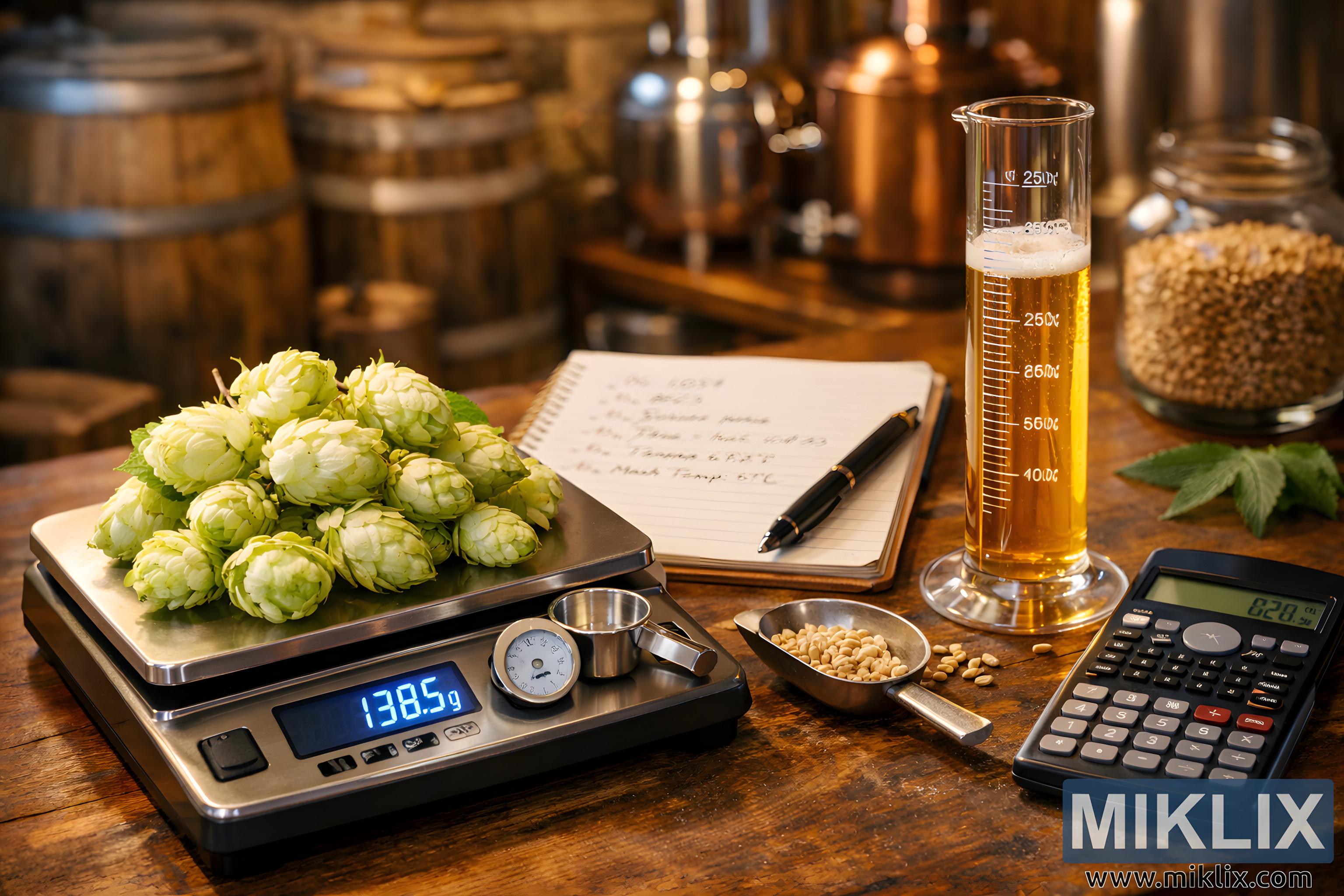 სურათზე წარმოდგენილია ფრთხილად შექმნილი ნატურმორტი, რომელიც ასახავს ლუდის მოხარშვის ხელოვნებაში ხელოსნობისა და გამოთვლების გადაკვეთას, რომელიც ბიანკას სვიის გამოყენებაზეა ორიენტირებული. წინა პლანზე მყარი ხის სამუშაო მაგიდა წარმოადგენს ლუდის მოხარშვის ზუსტი ინსტრუმენტების განლაგების საფუძველს. ამ სივრცეში დომინირებს ციფრული ზუსტი სასწორი, რომლის გახეხილი ლითონის ზედაპირი რბილ, ბუნებრივ სინათლეს ირეკლავს. სასწორზე ახლად დაკრეფილი ბიანკას სვიის დიდი გროვაა განთავსებული, მათი ღია მწვანე კონუსები მჭიდროდ არის დალაგებული და ტექსტურირებული, რაც სიახლეს და არომატულ ინტენსივობას გადმოსცემს. სასწორის განათებული ეკრანი ხაზს უსვამს სიზუსტის თემას, რაც მიანიშნებს ფრთხილად გაზომვაზე, როგორც ლუდის მოხარშვის პროცესში კრიტიკულ ეტაპზე. ახლოს, ლუდის მოხარშვის ხელსაწყოების მცირე ასორტიმენტი - როგორიცაა ლითონის კოვზები და კომპაქტური თერმომეტრი - პრაქტიკული ექსპერიმენტისა და კონტროლის შეგრძნებას მატებს.