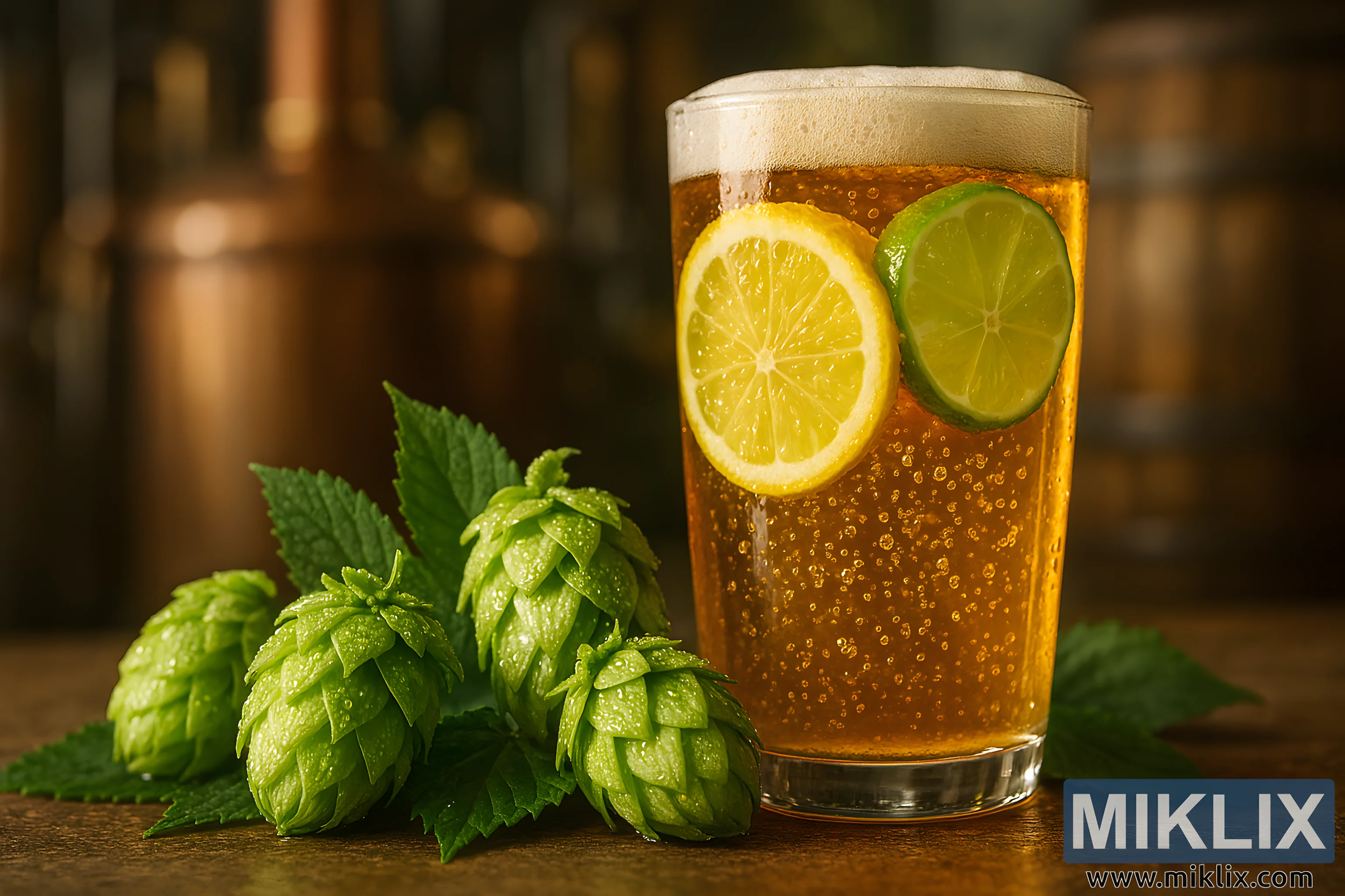 სვიის უკან, ოქროსფერი ლუდის გამჭვირვალე, ერთპინიანი ჭიქა ოდნავ გადახრილია. ლუდი თბილი, ქარვისფერი ელფერით ანათებს, წვრილი ბუშტები კი ზედაპირზე ნაზად ამოდის და ნაზ ქაფიან თავსახურს ქმნის. ჭიქაში ციტრუსის კაშკაშა ნაჭრები - ერთი ლიმონი და ერთი ლაიმი - გამჭვირვალე ელფერით ტივტივებს. წინა მხარეს განლაგებული ლიმონის ნაჭერი მდიდარ ყვითელ რბილობსა და ღია ფერის ცედრას ავლენს, ხოლო მის უკან მოთავსებული ლაიმის ნაჭერი მკვეთრი მწვანე კონტრასტს სძენს. ჭიქას კონდენსაციის პაწაწინა წვეთები ეკვრის, რაც სიახლის და რეალიზმის შეგრძნებას აძლიერებს.