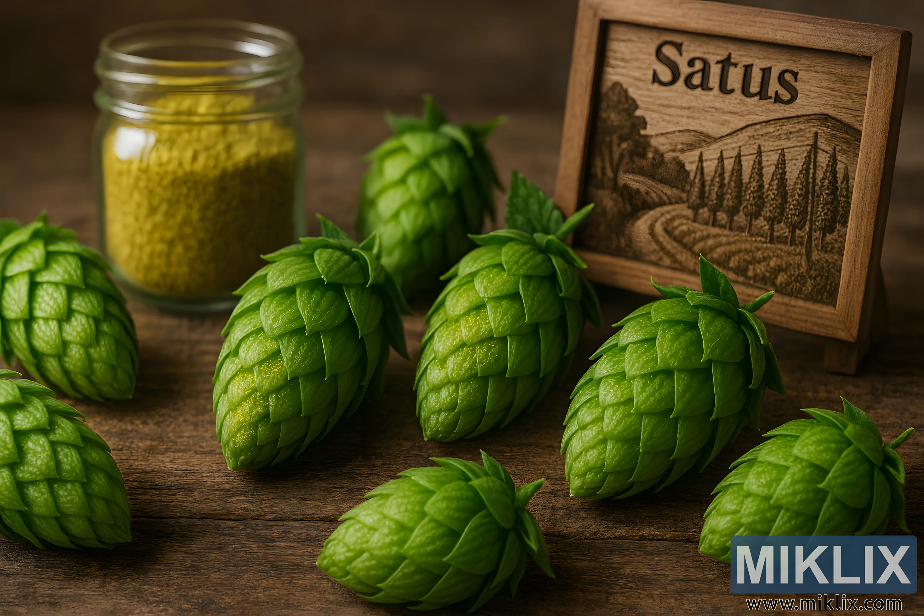 ეს ულტრამაღალი გარჩევადობის ლანდშაფტის ფოტო ასახავს ლუდის ხარშვის ხელოსნურ ხელოვნებაზე ორიენტირებული მდიდარი ტექსტურისა და მიმზიდველი სცენის მქონე გარემოს. წინა პლანზე, ახლო ხედი აჩვენებს კაშკაშა მწვანე Satus-ის სვიის გირჩების საგულდაგულო განლაგებას, რომლებიც ამინდის გამოფიტულ ხის ზედაპირზეა დაყრდნობილი. თითოეული გირჩი ბოტანიკური სიზუსტით არის გადაღებული, სადაც წარმოდგენილია მჭიდროდ დაფენილი ფოთლები და მათში ჩამჯდარი მბზინავი ოქროსფერი ლუპულინის ჯირკვლები. გირჩები ოდნავ განსხვავდებიან ზომითა და ორიენტაციით, რაც კადრში ბუნებრივ რიტმს ქმნის, ხოლო ახლომდებარე ფანჯრიდან რბილი, გაფანტული ბუნებრივი შუქი აძლიერებს მათ სიახლეს და სიღრმეს.