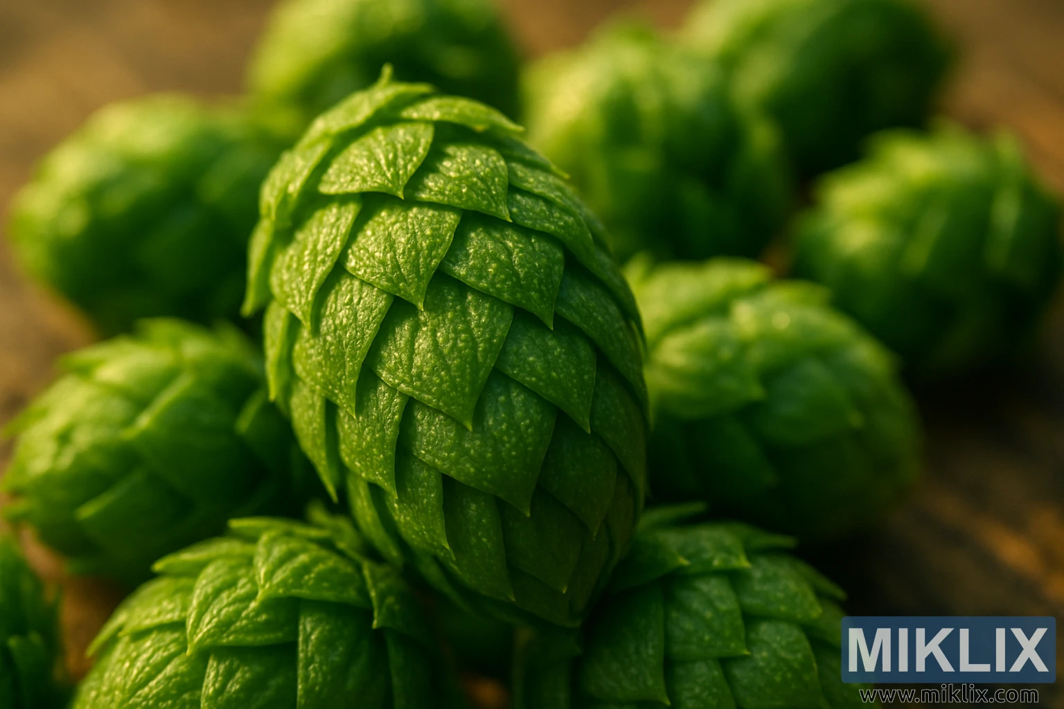 სურათზე წარმოდგენილია ახლად მოკრეფილი სმარაგდის სვიის გირჩების საოცრად დეტალური ახლო ხედი, რომლებიც პატარა მტევნად არიან განლაგებული ხის ზედაპირზე. კომპოზიცია ხაზს უსვამს ხელოსნობას და ბუნებრივ სილამაზეს, სადაც მთავარი სვიის გირჩა ცენტრალურ წინა პლანზე იკავებს მკვეთრი ფოკუსით, ხოლო მიმდებარე გირჩები რბილად ბუნდოვნად გამოიყურება ფონზე. ეს შერჩევითი ფოკუსი ქმნის სიღრმის ნათელ შეგრძნებას და მნახველის მზერას მაშინვე მიიპყრობს მთავარი ობიექტის რთულ სტრუქტურაზე.