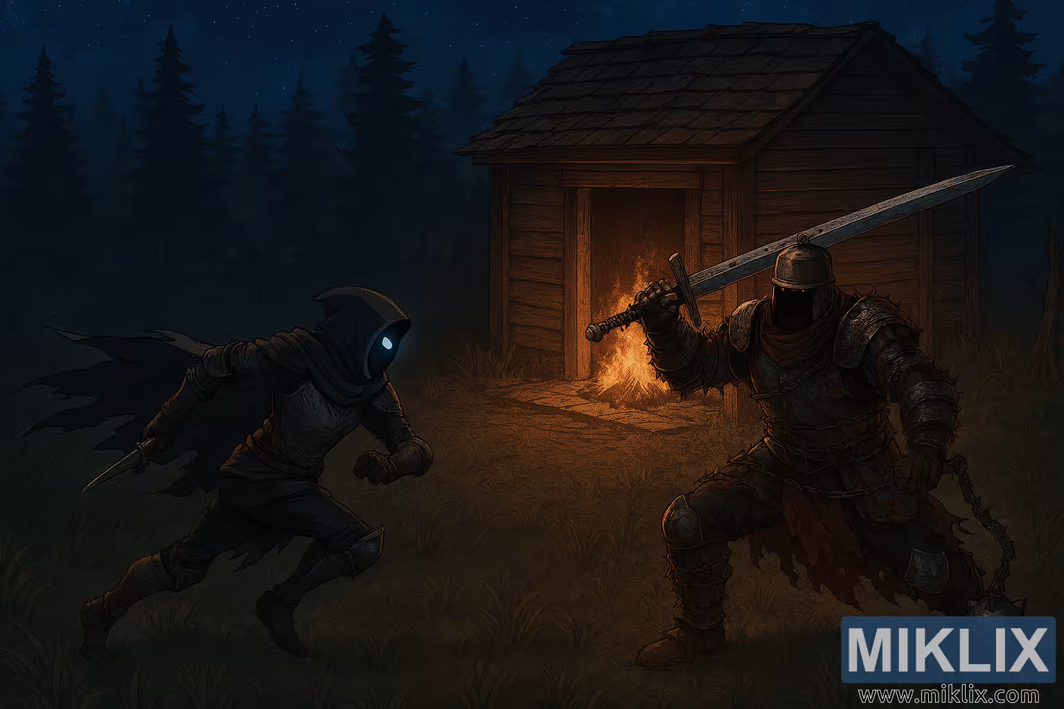 მაღალი გარჩევადობის ანიმეს სტილის ილუსტრაცია ასახავს დრამატულ ღამის ბრძოლას ორ ლეგენდარულ ელდენ რინგის პერსონაჟს შორის: შავი დანის ჯავშანში გახვეულს და ზარის მატარებელ მონადირეს შორის. სცენა დანახულია უკან გადაწეული, ამაღლებული იზომეტრიული პერსპექტივიდან, რომელიც ავლენს მიმდებარე რელიეფის, ტყის და სოფლური ქოხის სახურავის მეტ ნაწილს. გარემო გაბრწყინებულია გრილი მთვარის შუქითა და თბილი ცეცხლის შუქით, რაც ქმნის ჩრდილებისა და ნათელი წერტილების მდიდარ ურთიერთქმედებას.