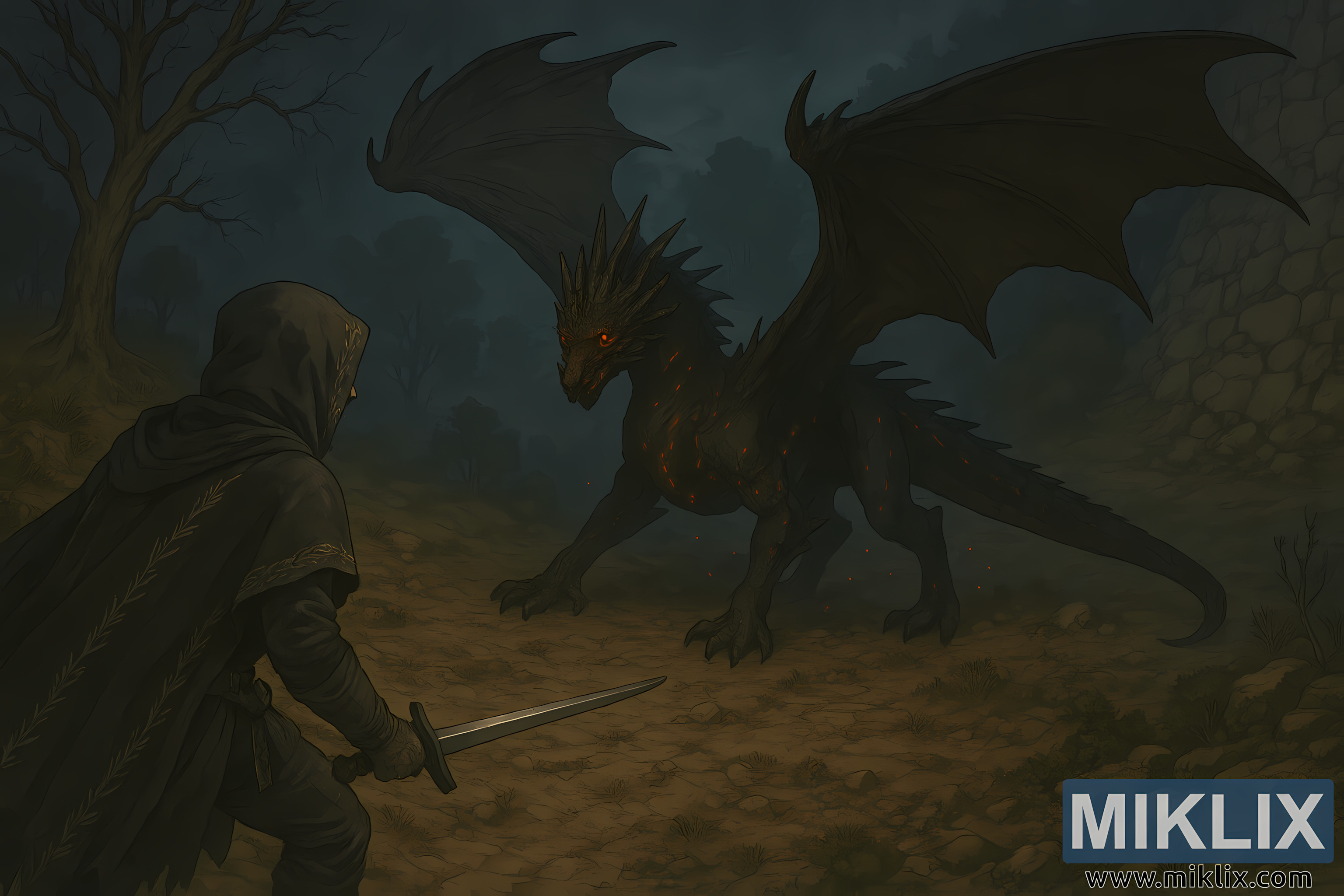 წინა პლანზე გამოსახულია დაჩრდილული, ბრძოლისთვის მზად, გამოწყობილი შავი დანის საკულტო ჯავშანში. ჯავშანი შედგება მუქი, დაძველებული მოსასხამისგან, რომელზეც რთული ნაქარგებია, რომლებიც უძველეს ფოთლებისა და ვაზის მოტივებს წააგავს და მხრებსა და ზურგზეა გადაფარებული. კაპიშონი მეომრის სახის უმეტეს ნაწილს ფარავს და მხოლოდ ძლიერ ყბასა და ფოკუსირებულ მზერას ავლენს. მათი პოზიცია დაბალია და მზადყოფნაშია, ერთი ფეხი წინ აქვს გადაწეული, მეორე კი არათანაბარ რელიეფზეა გამაგრებული. მარცხენა ხელში მტკიცედ უჭირავთ სწორი ფოლადის ხმალი, რომელიც თავდაცვით პოზაში დრაკონისკენაა მიმართული.