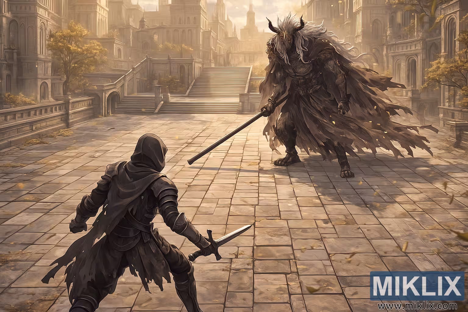 „Tarnished“-სა და „Omen King“-ს შორის მანძილი ელექტრომაგნიტურად იგრძნობა - ცარიელი სივრცე, რომელიც გარდაუვალი ძალადობითაა სავსე. ეზოში სხვა პერსონაჟები ან არსებები არ არიან, რაც ემოციურ სიცხადეს აძლიერებს: ორი მარტოხელა ფიგურა, ბედისწერაში ჩაკეტილები. სურათი მოძრაობამდე იმ ერთადერთ სუნთქვას იპყრობს, სადაც ორივე მებრძოლი ერთმანეთს ღია ქვასა და ისტორიულად შეწონილ ჰაერში ზომავს.