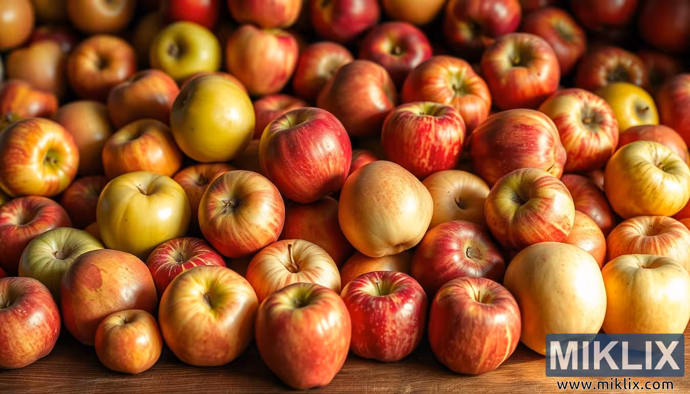 ಬೆಚ್ಚಗಿನ ಬೆಳಕಿನಲ್ಲಿ ಹಳ್ಳಿಗಾಡಿನ ಮರದ ಮೇಜಿನ ಮೇಲೆ ಕೆಂಪು, ಹಸಿರು ಮತ್ತು ಆನುವಂಶಿಕ ಸೇಬುಗಳ ಹೇರಳ ಪ್ರದರ್ಶನ, ಈ ಹಣ್ಣಿನ ಸಮೃದ್ಧಿ ಮತ್ತು ವೈವಿಧ್ಯತೆಯನ್ನು ಎತ್ತಿ ತೋರಿಸುತ್ತದೆ.