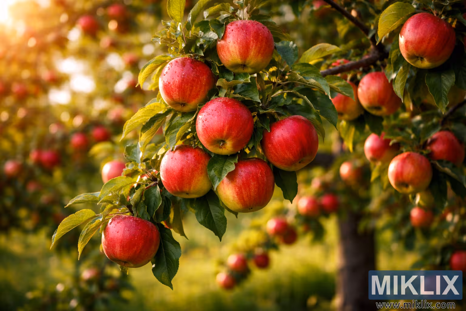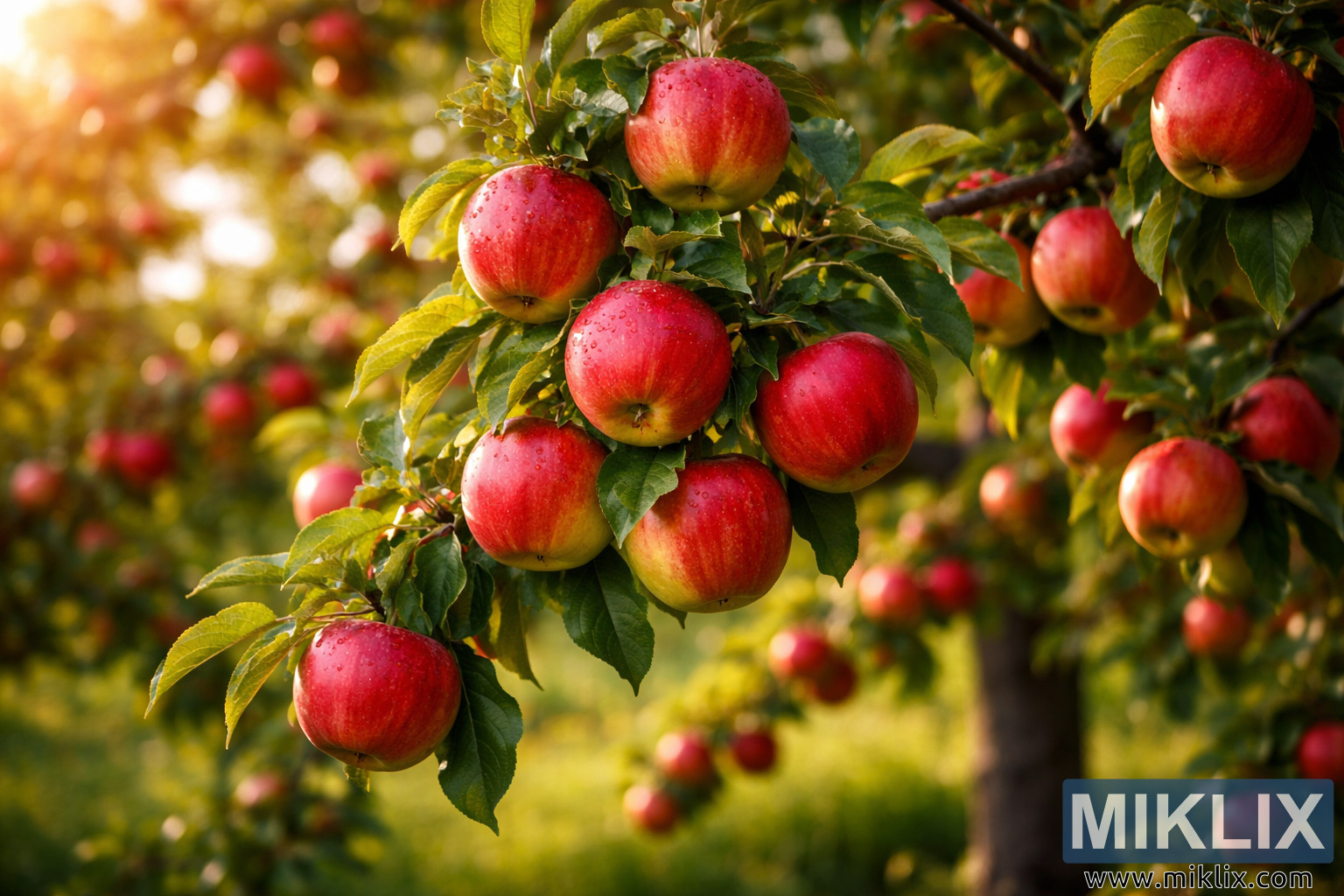 ಈ ಚಿತ್ರವು ಸುಗ್ಗಿಯ ಋತುವಿನಲ್ಲಿ ಸಮೃದ್ಧವಾಗಿ ಬೆಳೆಯುತ್ತಿರುವ ಸೇಬಿನ ಮರದ ಸುಂದರ ನೋಟವನ್ನು ಸೆರೆಹಿಡಿಯುತ್ತದೆ, ಇದನ್ನು ಬೆಚ್ಚಗಿನ, ನೈಸರ್ಗಿಕ ಭೂದೃಶ್ಯದ ದೃಷ್ಟಿಕೋನದಲ್ಲಿ ಪ್ರಸ್ತುತಪಡಿಸಲಾಗಿದೆ. ಮುಂಭಾಗದಲ್ಲಿ, ಒಂದು ಗಟ್ಟಿಮುಟ್ಟಾದ ಕೊಂಬೆಯು ಚೌಕಟ್ಟಿನ ಬಲಭಾಗದಿಂದ ಮಧ್ಯದ ಕಡೆಗೆ ಆಕರ್ಷಕವಾಗಿ ಕಮಾನಿನಂತೆ ಬಾಗುತ್ತದೆ, ಮಾಗಿದ ಸೇಬುಗಳ ಭಾರವಾದ ಗುಂಪನ್ನು ಹೊಂದಿರುತ್ತದೆ. ಸೇಬುಗಳು ಪ್ರಧಾನವಾಗಿ ಕೆಂಪು ಬಣ್ಣದ್ದಾಗಿದ್ದು, ಅವುಗಳ ಬುಡದ ಬಳಿ ಚಿನ್ನದ ಹಳದಿ ಬಣ್ಣದ ಸೂಕ್ಷ್ಮ ಇಳಿಜಾರುಗಳನ್ನು ಹೊಂದಿರುತ್ತವೆ, ಇದು ಪೂರ್ಣ ಪಕ್ವತೆ ಮತ್ತು ಮಾಧುರ್ಯವನ್ನು ಸೂಚಿಸುತ್ತದೆ. ಅವುಗಳ ಚರ್ಮವು ನಯವಾದ ಮತ್ತು ಹೊಳಪಿನಿಂದ ಕೂಡಿದ್ದು, ತೇವಾಂಶದ ಸಣ್ಣ ಹನಿಗಳಿಂದ ಕೂಡಿದ್ದು ಅದು ಸೂರ್ಯನ ಬೆಳಕನ್ನು ಸೆರೆಹಿಡಿಯುತ್ತದೆ ಮತ್ತು ದೃಶ್ಯಕ್ಕೆ ಉಲ್ಲಾಸಕರ, ಕೇವಲ ಆರಿಸಲಾದ ಭಾವನೆಯನ್ನು ನೀಡುತ್ತದೆ.