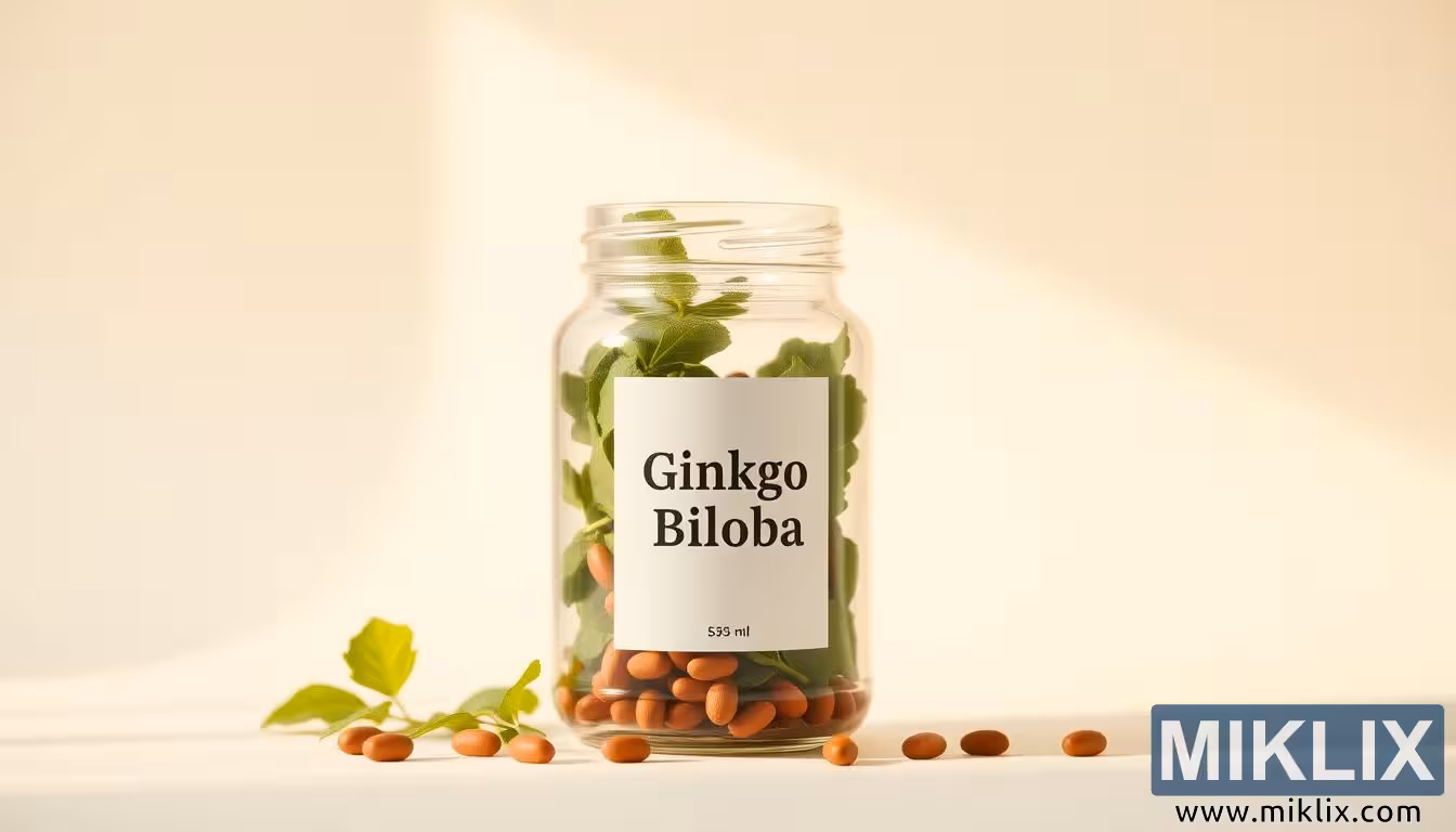 ಈ ಗಿಡಮೂಲಿಕೆ ಪರಿಹಾರದ ಶುದ್ಧತೆ, ಆರೋಗ್ಯ ಮತ್ತು ನೈಸರ್ಗಿಕ ಪ್ರಯೋಜನಗಳನ್ನು ಸಂಕೇತಿಸುವ ರೋಮಾಂಚಕ ಹಸಿರು ಎಲೆಗಳು ಮತ್ತು ಬೀಜಗಳನ್ನು ಹೊಂದಿರುವ ಗಿಂಕ್ಗೊ ಬಿಲೋಬ ಪೂರಕಗಳ ಜಾರ್.