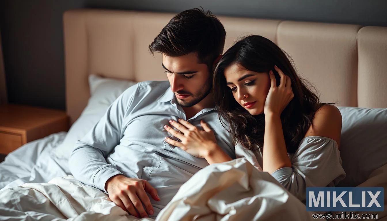 ಹಾಸಿಗೆಯ ಮೇಲೆ ದಂಪತಿಗಳ ಕೋಮಲ ದೃಶ್ಯ, ಪುರುಷನು ಖಿನ್ನತೆಗೆ ಒಳಗಾಗಿದ್ದಾನೆ ಮತ್ತು ಮಹಿಳೆ ಅವನನ್ನು ಸಮಾಧಾನಪಡಿಸುತ್ತಾಳೆ, ಇದು ಸಹಾನುಭೂತಿ, ಅನ್ಯೋನ್ಯತೆ ಮತ್ತು ಲೈಂಗಿಕ ಅಪಸಾಮಾನ್ಯ ಕ್ರಿಯೆಯ ಸವಾಲುಗಳನ್ನು ಸಂಕೇತಿಸುತ್ತದೆ.
