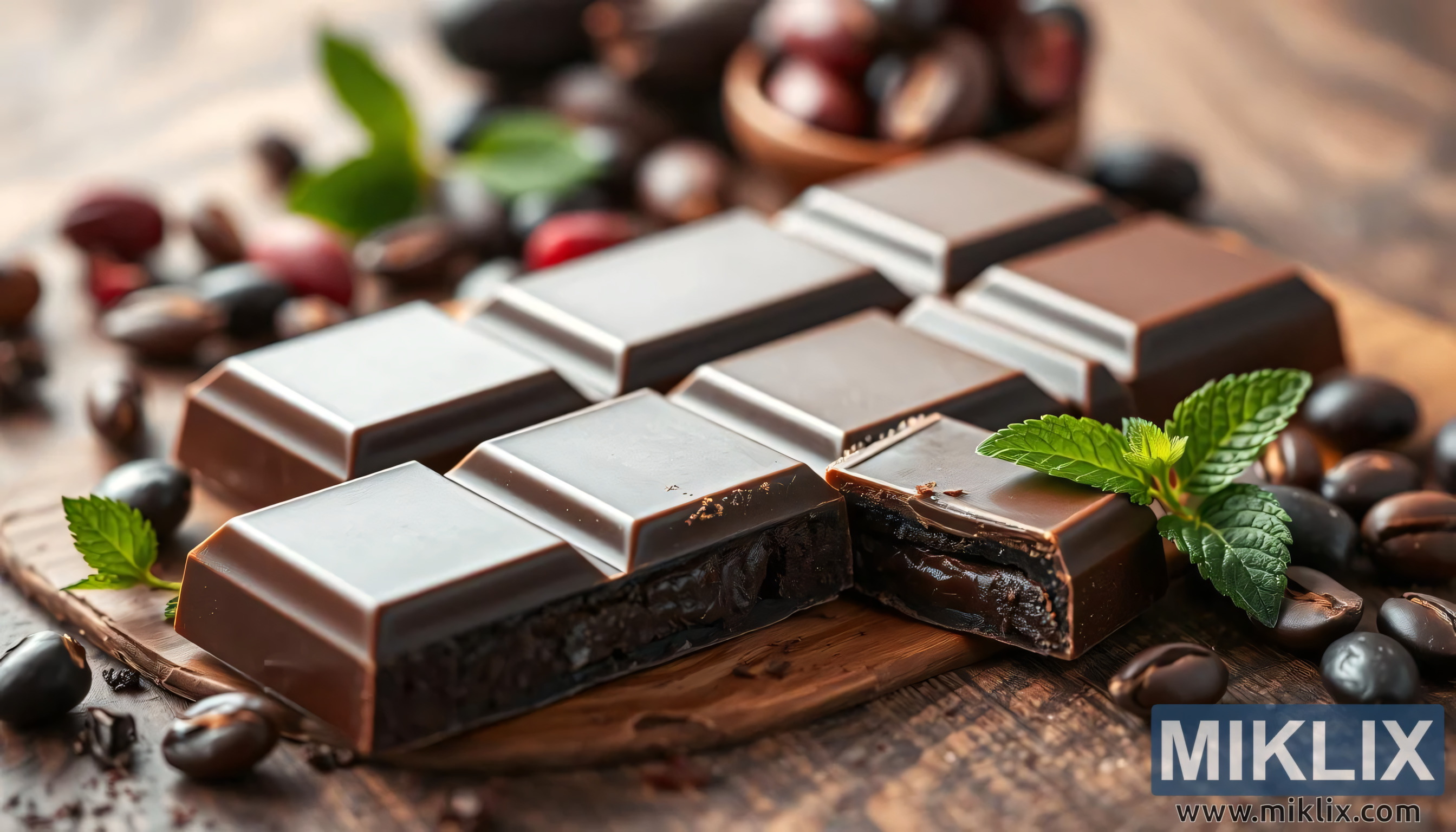 ಹೊಳಪುಳ್ಳ ಸ್ಲೈಸ್, ಕೋಕೋ ಬೀನ್ಸ್, ಹಣ್ಣುಗಳು ಮತ್ತು ಪುದೀನದೊಂದಿಗೆ ಉತ್ತಮ ಗುಣಮಟ್ಟದ ಡಾರ್ಕ್ ಚಾಕೊಲೇಟ್ ಬಾರ್, ಅದರ ಉತ್ಕರ್ಷಣ ನಿರೋಧಕಗಳು, ಹೃದಯದ ಆರೋಗ್ಯ ಮತ್ತು ಮನಸ್ಥಿತಿಯ ಪ್ರಯೋಜನಗಳನ್ನು ಎತ್ತಿ ತೋರಿಸುತ್ತದೆ.
