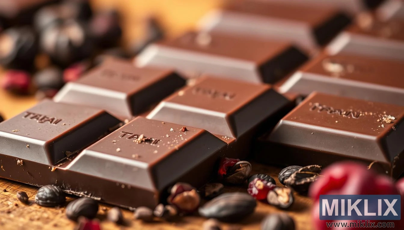 ಹೊಳಪುಳ್ಳ ಮೇಲ್ಮೈ, ಕೋಕೋ ನಿಬ್ಗಳು ಮತ್ತು ರೂಬಿ ಹಣ್ಣುಗಳನ್ನು ಹೊಂದಿರುವ ಡಾರ್ಕ್ ಚಾಕೊಲೇಟ್ ಬಾರ್ನ ಹತ್ತಿರದ ನೋಟ, ಉತ್ಕರ್ಷಣ ನಿರೋಧಕಗಳು ಮತ್ತು ಭೋಗ ಮತ್ತು ಸ್ವಾಸ್ಥ್ಯದ ಮಿಶ್ರಣವನ್ನು ಎತ್ತಿ ತೋರಿಸುತ್ತದೆ.