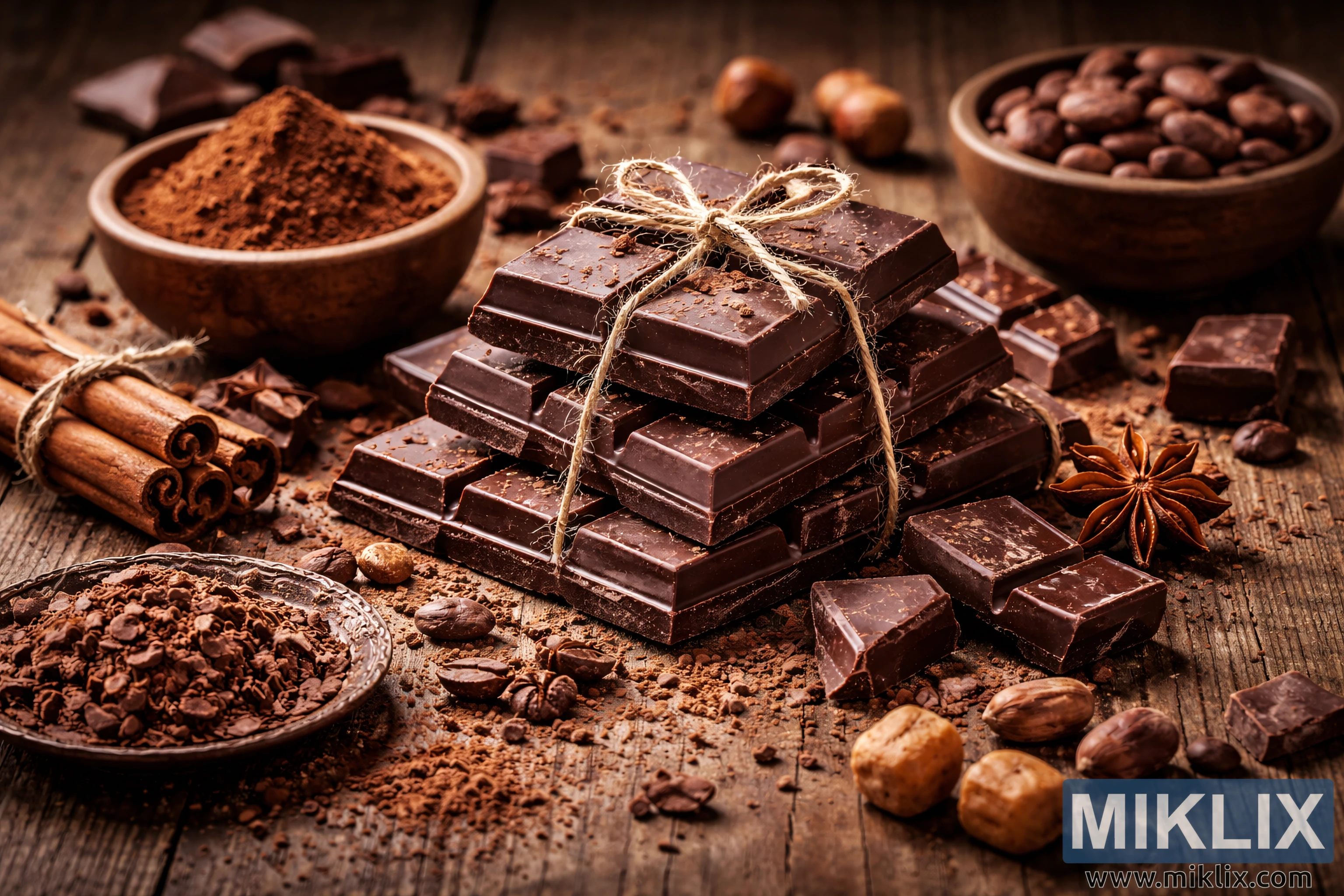 ಕೋಕೋ ಪೌಡರ್, ಬೀನ್ಸ್, ದಾಲ್ಚಿನ್ನಿ, ಹ್ಯಾಝಲ್ನಟ್ಸ್ ಮತ್ತು ಬೆಚ್ಚಗಿನ ವಾತಾವರಣದ ಬೆಳಕಿನೊಂದಿಗೆ ಹಳ್ಳಿಗಾಡಿನ ಮರದ ಮೇಜಿನ ಮೇಲೆ ಕುಶಲಕರ್ಮಿ ಡಾರ್ಕ್ ಚಾಕೊಲೇಟ್ನ ಹೆಚ್ಚಿನ ರೆಸಲ್ಯೂಶನ್ ಸ್ಟಿಲ್ ಲೈಫ್.