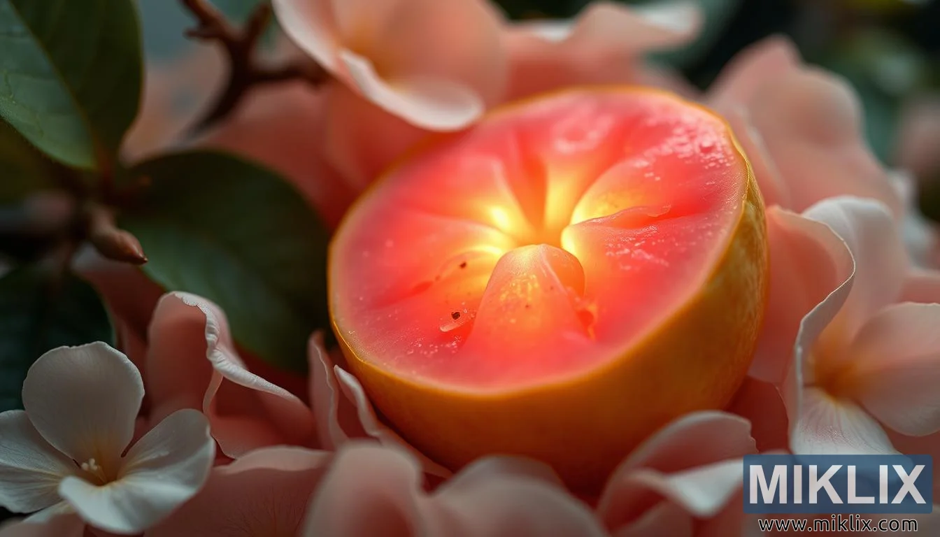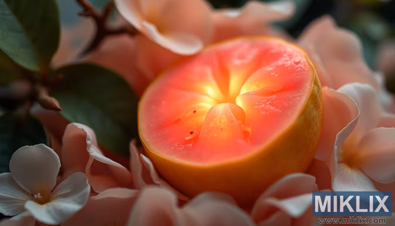 ಮೃದುವಾದ, ಬೆಚ್ಚಗಿನ ಬೆಳಕಿನಲ್ಲಿ ಸೂಕ್ಷ್ಮ ದಳಗಳಿಂದ ಸುತ್ತುವರೆದಿರುವ ಪೇರಲ, ನೆಮ್ಮದಿಯನ್ನು ಉಂಟುಮಾಡುತ್ತದೆ ಮತ್ತು ಅದರ ಸಾಂತ್ವನಕಾರಿ, ಪುನಶ್ಚೈತನ್ಯಕಾರಿ ಆರೋಗ್ಯ ಪ್ರಯೋಜನಗಳನ್ನು ಎತ್ತಿ ತೋರಿಸುತ್ತದೆ.