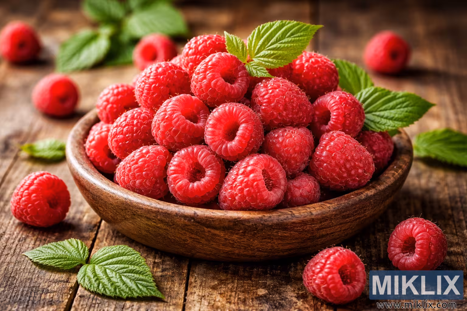 ಚಿತ್ರ: ಹಳ್ಳಿಗಾಡಿನ ಮರದ ಬಟ್ಟಲಿನಲ್ಲಿ ತಾಜಾ ರಾಸ್್ಬೆರ್ರಿಸ್