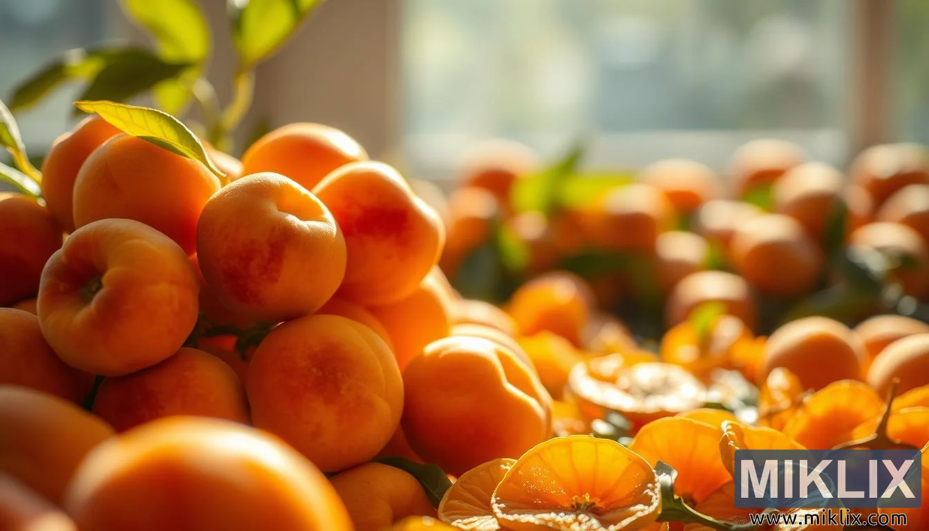 ಒಣಗಿದ ಹೋಳುಗಳು ಮತ್ತು ಎಲೆಗಳೊಂದಿಗೆ ನೈಸರ್ಗಿಕ ಸೂರ್ಯನ ಬೆಳಕಿನಲ್ಲಿ ಹೊಳೆಯುತ್ತಿರುವ ಮಾಗಿದ ಏಪ್ರಿಕಾಟ್ಗಳು, ಅವುಗಳ ಉತ್ಕರ್ಷಣ ನಿರೋಧಕ ಶಕ್ತಿ, ಸಮೃದ್ಧಿ ಮತ್ತು ಆರೋಗ್ಯ ಪ್ರಯೋಜನಗಳನ್ನು ಎತ್ತಿ ತೋರಿಸುತ್ತವೆ.