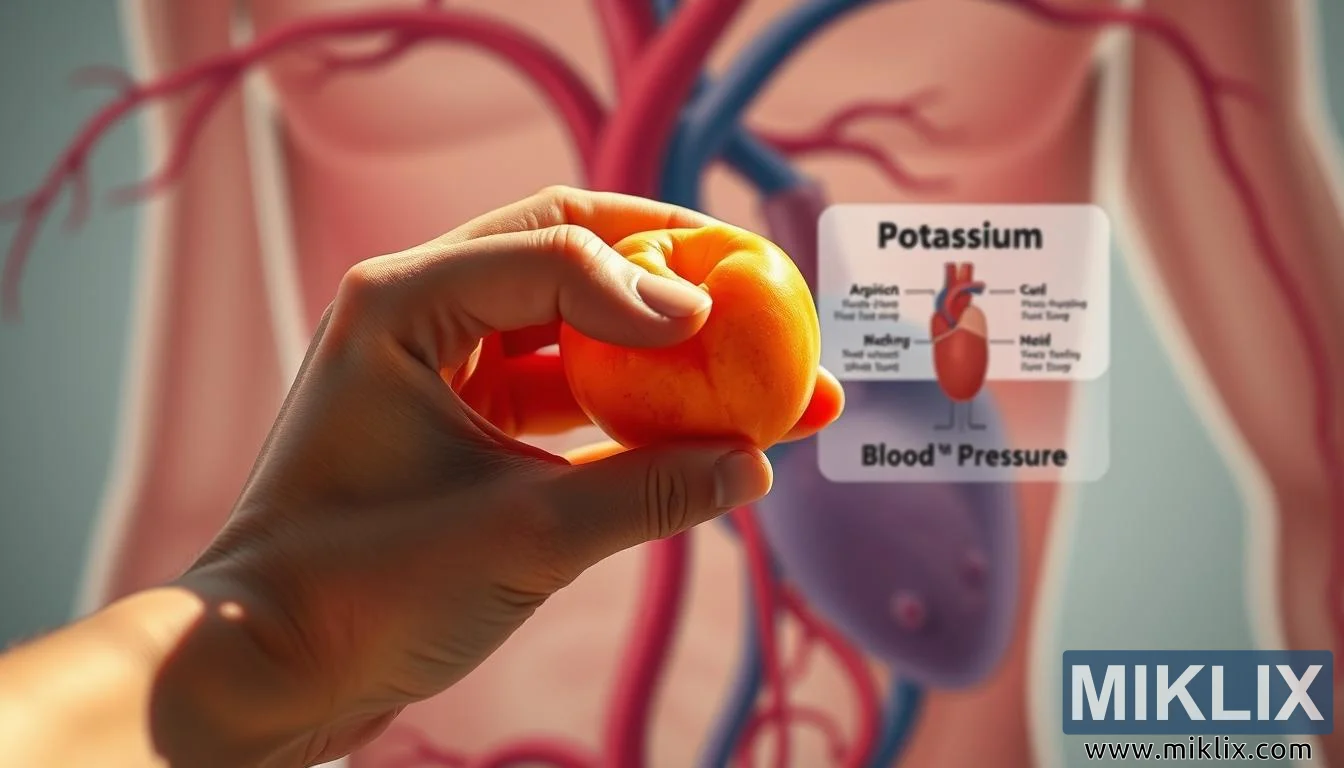 ಪೊಟ್ಯಾಸಿಯಮ್-ಭರಿತ ಏಪ್ರಿಕಾಟ್ ಅನ್ನು ಹಿಡಿದಿರುವ ಕೈಯ ಹತ್ತಿರದ ಚಿತ್ರ, ರಕ್ತನಾಳಗಳು ಮತ್ತು ಹಿನ್ನೆಲೆಯಲ್ಲಿ ವೈದ್ಯಕೀಯ ರೇಖಾಚಿತ್ರ, ರಕ್ತದೊತ್ತಡವನ್ನು ನಿಯಂತ್ರಿಸುವಲ್ಲಿ ಅದರ ಪಾತ್ರವನ್ನು ಎತ್ತಿ ತೋರಿಸುತ್ತದೆ.