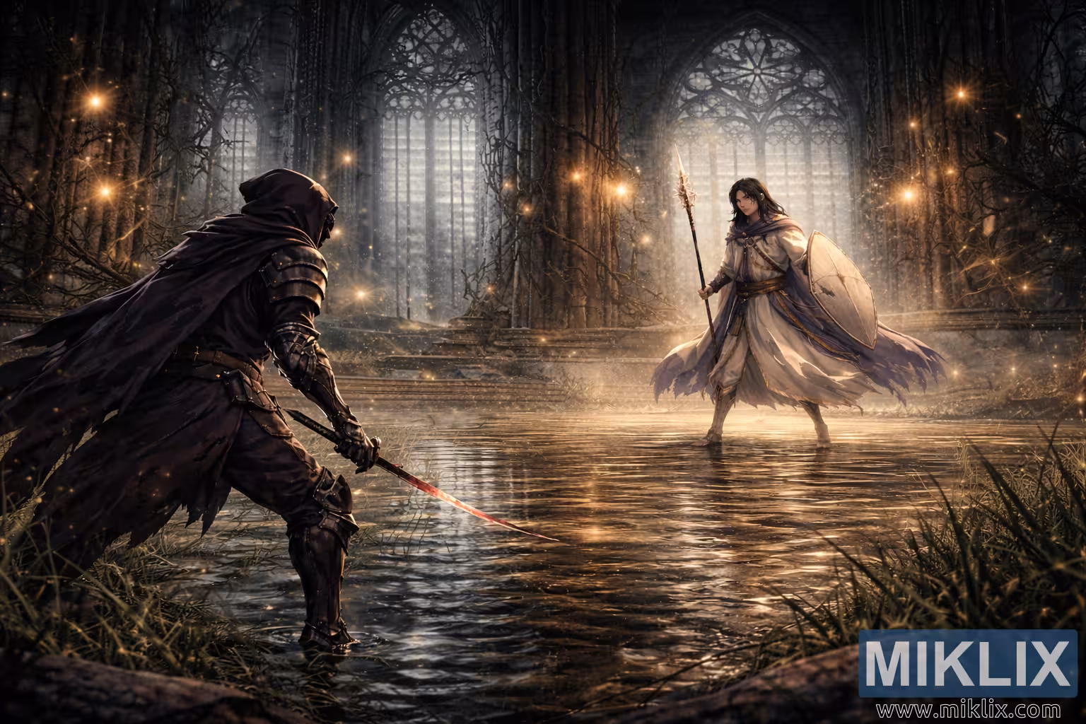 ವಿಸ್ತರಿಸಿದ ಹಿನ್ನೆಲೆಯು ವಾತಾವರಣ ಮತ್ತು ಭವ್ಯತೆಯ ಅರ್ಥವನ್ನು ಆಳಗೊಳಿಸುತ್ತದೆ. ಕ್ಯಾಥೆಡ್ರಲ್ ಒಳಭಾಗದಲ್ಲಿ ಬೃಹತ್ ಕಂಬಗಳು ಸಾಲುಗಟ್ಟಿ ನಿಂತಿವೆ, ಅವುಗಳ ಬಿರುಕು ಬಿಟ್ಟ ಮೇಲ್ಮೈಗಳು ತೆವಳುವ ಬಳ್ಳಿಗಳಿಂದ ಹೆಣೆದುಕೊಂಡಿವೆ, ಇದು ಶತಮಾನಗಳ ಪರಿತ್ಯಾಗ ಮತ್ತು ಪ್ರಕೃತಿಯ ನಿಧಾನಗತಿಯ ಪುನಃಸ್ಥಾಪನೆಯನ್ನು ಸೂಚಿಸುತ್ತದೆ. ಸಂಕೀರ್ಣವಾದ ಬಣ್ಣದ ಗಾಜಿನ ಕಿಟಕಿಗಳು ಮಸುಕಾದ ಹಗಲು ಬೆಳಕನ್ನು ತಂಪಾದ ಮಬ್ಬು ಮೂಲಕ ಕತ್ತರಿಸಿ ಹರಡಿದ ಕಿರಣಗಳಾಗಿ ಫಿಲ್ಟರ್ ಮಾಡುತ್ತವೆ, ತೇಲುವ ಚಿನ್ನದ ಕಣಗಳನ್ನು ಬೆಳಗಿಸುತ್ತವೆ, ಇದು ಕಲ್ಲಿದ್ದಲು ಅಥವಾ ಮಾಂತ್ರಿಕ ಮಿಂಚುಹುಳುಗಳನ್ನು ಹೋಲುತ್ತದೆ. ಈ ಹೊಳೆಯುವ ಕಣಗಳು ಗಾಳಿಯ ಮೂಲಕ ಸೋಮಾರಿಯಾಗಿ ಚಲಿಸುತ್ತವೆ, ತಂಪಾದ ನೀಲಿಗಳು, ಮಂದ ಬೂದುಗಳು ಮತ್ತು ಹವಾಮಾನದ ಕಲ್ಲಿನ ಕಂದುಗಳಿಂದ ಪ್ರಾಬಲ್ಯ ಹೊಂದಿರುವ ಪ್ಯಾಲೆಟ್ಗೆ ಉಷ್ಣತೆಯನ್ನು ಸೇರಿಸುತ್ತವೆ. ನೆಲವನ್ನು ಆವರಿಸಿರುವ ನೀರಿನ ತೆಳುವಾದ ಪದರವು ಕನ್ನಡಿಯಂತೆ ಕಾರ್ಯನಿರ್ವಹಿಸುತ್ತದೆ, ರಕ್ಷಾಕವಚ, ನಿಲುವಂಗಿಗಳು, ಕಂಬಗಳು ಮತ್ತು ಬೆಳಕಿನ ವಿರೂಪಗೊಂಡ ಚಿತ್ರಗಳನ್ನು ಪ್ರತಿಬಿಂಬಿಸುತ್ತದೆ. ಪ್ರತಿ ಎಚ್ಚರಿಕೆಯ ಹೆಜ್ಜೆಯಿಂದ ಹೊರಕ್ಕೆ ಸೌಮ್ಯವಾದ ಅಲೆಗಳು ಹರಡುತ್ತವೆ, ಸೂಕ್ಷ್ಮವಾಗಿ ಪ್ರತಿಬಿಂಬಗಳನ್ನು ಮುರಿಯುತ್ತವೆ ಮತ್ತು ಕ್ಷಣದ ಸ್ಥಿರತೆಯನ್ನು ಬಲಪಡಿಸುತ್ತವೆ. ಚೌಕಟ್ಟಿನ ಅಂಚುಗಳಲ್ಲಿ ಹುಲ್ಲು, ಚದುರಿದ ಶಿಲಾಖಂಡರಾಶಿಗಳು ಮತ್ತು ಪುಡಿಪುಡಿಯಾದ ಕಲ್ಲುಗಳು ಕೊಳೆತ ಮತ್ತು ಸಮಯದ ನಿರಂತರ ಅಂಗೀಕಾರವನ್ನು ಮತ್ತಷ್ಟು ಸೂಚಿಸುತ್ತವೆ.