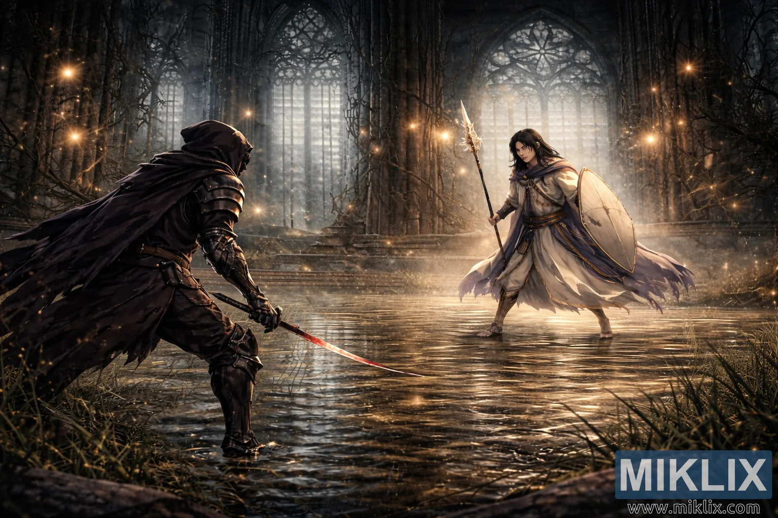 ಪರಿಸರವು ಈ ಒತ್ತಡವನ್ನು ಮಾಪಕ ಮತ್ತು ವಾತಾವರಣದ ಮೂಲಕ ವರ್ಧಿಸುತ್ತದೆ. ಕ್ಯಾಥೆಡ್ರಲ್ ಒಳಭಾಗದಲ್ಲಿ ಎತ್ತರದ ಕಲ್ಲಿನ ಕಂಬಗಳು ಸಾಲುಗಟ್ಟಿ ನಿಂತಿವೆ, ಅವುಗಳ ಬಿರುಕು ಬಿಟ್ಟ ಮೇಲ್ಮೈಗಳು ತೆವಳುವ ಬಳ್ಳಿಗಳಿಂದ ಹೆಣೆದುಕೊಂಡಿವೆ, ಇದು ಶತಮಾನಗಳ ಪರಿತ್ಯಾಗ ಮತ್ತು ಪ್ರಕೃತಿಯ ನಿಧಾನಗತಿಯ ಪುನಃಸ್ಥಾಪನೆಯನ್ನು ಸೂಚಿಸುತ್ತದೆ. ಎತ್ತರದ, ಸಂಕೀರ್ಣವಾದ ಬಣ್ಣದ ಗಾಜಿನ ಕಿಟಕಿಗಳು ಮಸುಕಾದ ಹಗಲು ಬೆಳಕನ್ನು ಹರಡಿದ ಕಿರಣಗಳಾಗಿ ಫಿಲ್ಟರ್ ಮಾಡುತ್ತವೆ, ಅದು ತಂಪಾದ ಮಬ್ಬು ಮೂಲಕ ಸೀಳುತ್ತದೆ, ಲೆಕ್ಕವಿಲ್ಲದಷ್ಟು ತೇಲುವ ಚಿನ್ನದ ಕಣಗಳನ್ನು ಬೆಳಗಿಸುತ್ತದೆ, ಇದು ಬೆಂಕಿ ಅಥವಾ ಮಾಂತ್ರಿಕ ಮಿಂಚುಹುಳುಗಳನ್ನು ಹೋಲುತ್ತದೆ. ಈ ಹೊಳೆಯುವ ಕಣಗಳು ಗಾಳಿಯ ಮೂಲಕ ಸೋಮಾರಿಯಾಗಿ ಚಲಿಸುತ್ತವೆ, ತಂಪಾದ ನೀಲಿಗಳು, ಮ್ಯೂಟ್ ಮಾಡಿದ ಬೂದುಗಳು ಮತ್ತು ಹವಾಮಾನದ ಕಲ್ಲಿನ ಕಂದುಗಳಿಂದ ಪ್ರಾಬಲ್ಯ ಹೊಂದಿರುವ ಪ್ಯಾಲೆಟ್ಗೆ ಉಷ್ಣತೆಯನ್ನು ಸೇರಿಸುತ್ತವೆ. ನೆಲವನ್ನು ಆವರಿಸಿರುವ ನೀರಿನ ತೆಳುವಾದ ಪದರವು ಕನ್ನಡಿಯಂತೆ ಕಾರ್ಯನಿರ್ವಹಿಸುತ್ತದೆ, ರಕ್ಷಾಕವಚ, ನಿಲುವಂಗಿಗಳು, ಕಂಬಗಳು ಮತ್ತು ಬೆಳಕಿನ ವಿರೂಪಗೊಂಡ ಚಿತ್ರಗಳನ್ನು ಪ್ರತಿಬಿಂಬಿಸುತ್ತದೆ. ಪ್ರತಿ ಎಚ್ಚರಿಕೆಯ ಹೆಜ್ಜೆಯಿಂದ ಹೊರಕ್ಕೆ ಸೌಮ್ಯವಾದ ಅಲೆಗಳು ಹರಡುತ್ತವೆ, ಸೂಕ್ಷ್ಮವಾಗಿ ಪ್ರತಿಬಿಂಬಗಳನ್ನು ಮುರಿಯುತ್ತವೆ ಮತ್ತು ಕ್ಷಣದ ಸ್ಥಿರತೆಯನ್ನು ಬಲಪಡಿಸುತ್ತವೆ. ಚೌಕಟ್ಟಿನ ಅಂಚುಗಳ ಉದ್ದಕ್ಕೂ ಹುಲ್ಲು ಮತ್ತು ಚದುರಿದ ಶಿಲಾಖಂಡರಾಶಿಗಳು ಕೊಳೆತ ಮತ್ತು ಸಮಯದ ಅಂಗೀಕಾರವನ್ನು ಸೂಚಿಸುತ್ತವೆ, ಫ್ಯಾಂಟಸಿ ಸೆಟ್ಟಿಂಗ್ ಅನ್ನು ಸ್ಪರ್ಶ ವಿವರಗಳಲ್ಲಿ ನೆಲಸಮಗೊಳಿಸುತ್ತವೆ.