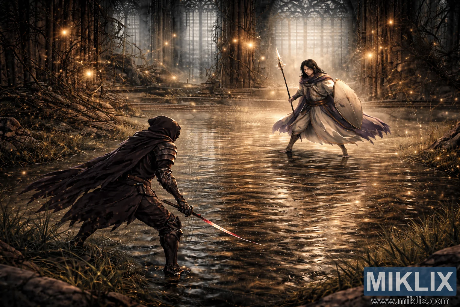 ಕ್ಯಾಥೆಡ್ರಲ್ ಪರಿಸರವು ಸ್ಮಾರಕ ಉಪಸ್ಥಿತಿಯೊಂದಿಗೆ ದೃಶ್ಯವನ್ನು ಪ್ರಾಬಲ್ಯಗೊಳಿಸುತ್ತದೆ. ಎತ್ತರದ ಕಲ್ಲಿನ ಕಂಬಗಳು ನೆರಳಿನಲ್ಲಿ ಏರುತ್ತವೆ, ಅವುಗಳ ಬಿರುಕು ಬಿಟ್ಟ ಮೇಲ್ಮೈಗಳು ತೆವಳುವ ಬಳ್ಳಿಗಳಿಂದ ಹೆಣೆದುಕೊಂಡಿವೆ, ಇದು ಶತಮಾನಗಳ ಪರಿತ್ಯಾಗ ಮತ್ತು ಪ್ರಕೃತಿಯ ಕ್ರಮೇಣ ಪುನಃಸ್ಥಾಪನೆಯನ್ನು ಸೂಚಿಸುತ್ತದೆ. ಎತ್ತರದ, ಸಂಕೀರ್ಣವಾದ ಬಣ್ಣದ ಗಾಜಿನ ಕಿಟಕಿಗಳು ಮಸುಕಾದ ಹಗಲು ಬೆಳಕನ್ನು ತಂಪಾದ ಮಬ್ಬುಗಳಲ್ಲಿ ಹರಡಿರುವ ಹರಡಿರುವ ಕಿರಣಗಳಾಗಿ ಫಿಲ್ಟರ್ ಮಾಡುತ್ತವೆ, ಇದು ಕೆಂಡಗಳು ಅಥವಾ ಮಾಂತ್ರಿಕ ಮಿಂಚುಹುಳುಗಳನ್ನು ಹೋಲುವ ಲೆಕ್ಕವಿಲ್ಲದಷ್ಟು ಚಿನ್ನದ ಕಣಗಳನ್ನು ಬೆಳಗಿಸುತ್ತವೆ. ಈ ತೇಲುತ್ತಿರುವ ಕಣಗಳು ಪ್ರಾಥಮಿಕವಾಗಿ ತಂಪಾದ ನೀಲಿಗಳು, ಮ್ಯೂಟ್ ಮಾಡಿದ ಬೂದುಗಳು ಮತ್ತು ಹವಾಮಾನದ ಕಲ್ಲಿನ ಕಂದುಗಳಿಂದ ಕೂಡಿದ ಪ್ಯಾಲೆಟ್ಗೆ ಉಷ್ಣತೆಯನ್ನು ಸೇರಿಸುತ್ತವೆ. ನೆಲವನ್ನು ಆವರಿಸಿರುವ ನೀರಿನ ತೆಳುವಾದ ಪದರವು ವಿಶಾಲವಾದ ಕನ್ನಡಿಯಂತೆ ಕಾರ್ಯನಿರ್ವಹಿಸುತ್ತದೆ, ರಕ್ಷಾಕವಚ, ನಿಲುವಂಗಿಗಳು, ಕಂಬಗಳು ಮತ್ತು ಬೆಳಕಿನ ವಿರೂಪಗೊಂಡ ಚಿತ್ರಗಳನ್ನು ಪ್ರತಿಬಿಂಬಿಸುತ್ತದೆ. ಪ್ರತಿ ಎಚ್ಚರಿಕೆಯ ಹೆಜ್ಜೆಯಿಂದ ಹೊರಕ್ಕೆ ಸೌಮ್ಯವಾದ ಅಲೆಗಳು ಹೊರಸೂಸುತ್ತವೆ, ಸೂಕ್ಷ್ಮವಾಗಿ ಪ್ರತಿಬಿಂಬಗಳನ್ನು ಮುರಿಯುತ್ತವೆ ಮತ್ತು ಕ್ಷಣದ ಸ್ಥಿರತೆಯನ್ನು ಬಲಪಡಿಸುತ್ತವೆ. ಚೌಕಟ್ಟಿನ ಅಂಚುಗಳಲ್ಲಿ ಹುಲ್ಲಿನ ಗಡ್ಡೆಗಳು, ಚದುರಿದ ಶಿಲಾಖಂಡರಾಶಿಗಳು ಮತ್ತು ಪುಡಿಪುಡಿಯಾದ ಕಲ್ಲುಗಳು ಕೊಳೆತ ಮತ್ತು ಸಮಯದ ನಿರಂತರ ಅಂಗೀಕಾರವನ್ನು ಮತ್ತಷ್ಟು ಒತ್ತಿಹೇಳುತ್ತವೆ.