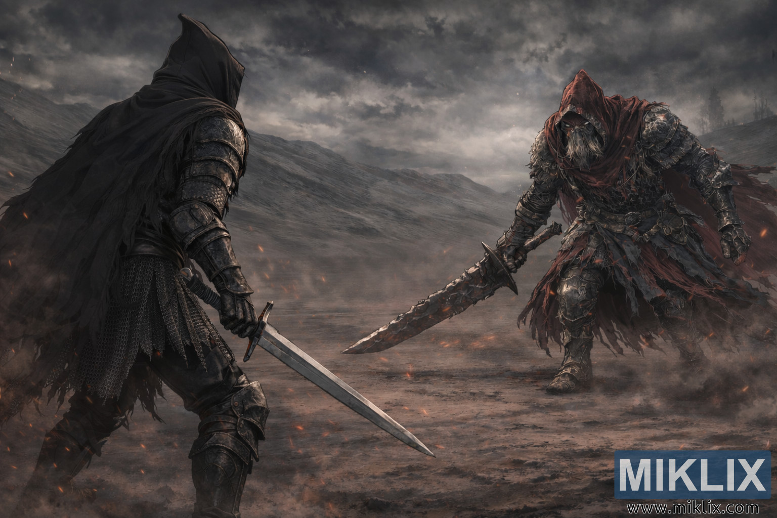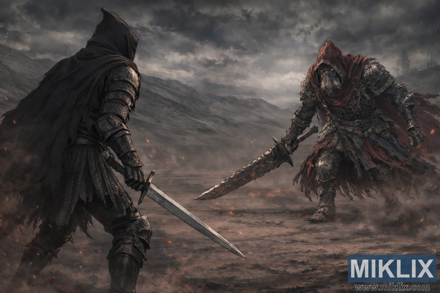ಮಸುಕಾದ ಬೂದಿ ಮರುಭೂಮಿಯಲ್ಲಿ ಅನಿಮೆ ಶೈಲಿಯ ಅಭಿಮಾನಿ ಕಲೆಯನ್ನು ಹೊಂದಿಸಲಾಗಿದೆ: ಶ್ಯಾಡೋ ಆರ್ಮರ್ನಲ್ಲಿರುವ ಆಶೆನ್ ಒನ್ ಸರಳವಾದ ಉದ್ದನೆಯ ಕತ್ತಿಯನ್ನು ಸ್ಥಿರಗೊಳಿಸುತ್ತದೆ, ಆದರೆ ಸ್ಲೇವ್ ನೈಟ್ ಗೇಲ್ ಹರಿದ ಕೆಂಪು ಕೇಪ್ ಮತ್ತು ಬೃಹತ್ ದೊಡ್ಡ ಕತ್ತಿಯೊಂದಿಗೆ ಸಮೀಪಿಸುತ್ತಾನೆ, ಯುದ್ಧ ಪ್ರಾರಂಭವಾಗುವ ಮೊದಲು ಉದ್ವಿಗ್ನ ಕ್ಷಣವನ್ನು ಸೆರೆಹಿಡಿಯುತ್ತಾನೆ.