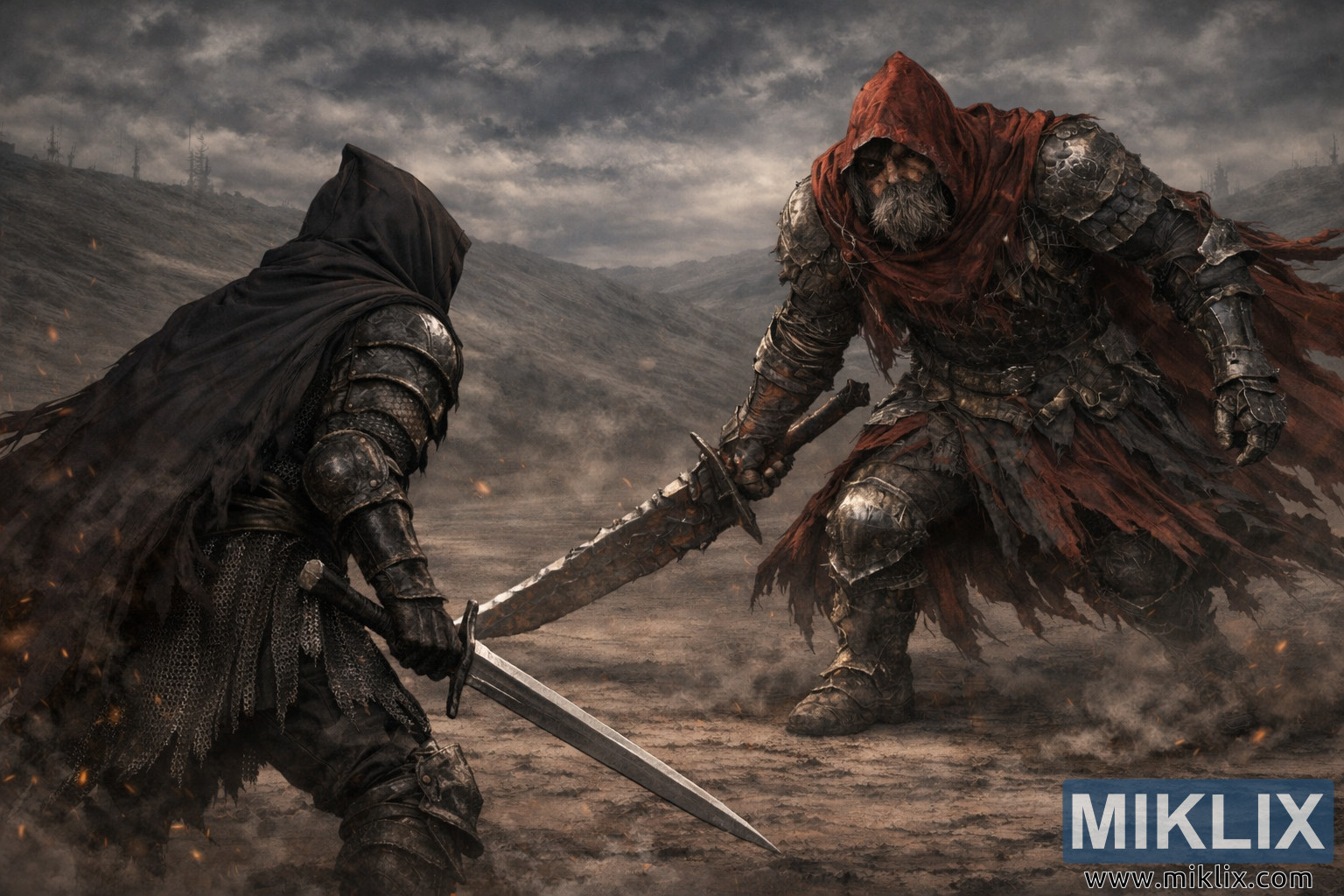 ಹೆಚ್ಚು ವಾಸ್ತವಿಕ, ವರ್ಣಮಯ ಡಾರ್ಕ್ ಸೌಲ್ಸ್ III ಅಭಿಮಾನಿಗಳ ಕಲಾ ನಿಲುಗಡೆ: ಶ್ಯಾಡೋ ಆರ್ಮರ್ ಧರಿಸಿದ ಆಶೆನ್ ಒನ್ ಸರಳವಾದ ಉದ್ದನೆಯ ಕತ್ತಿಯನ್ನು ಸ್ಥಿರಗೊಳಿಸುತ್ತದೆ, ಸ್ಲೇವ್ ನೈಟ್ ಗೇಲ್ ಹರಿದ ಕೆಂಪು ಕೇಪ್ನೊಂದಿಗೆ ಹರಿದ ದೊಡ್ಡ ಕತ್ತಿಯೊಂದಿಗೆ ಬಿರುಗಾಳಿಯ ಮೋಡಗಳು ಮತ್ತು ತೇಲುತ್ತಿರುವ ಬೆಂಕಿಯ ಕೆಳಗೆ ಮುಚ್ಚುತ್ತಾನೆ.