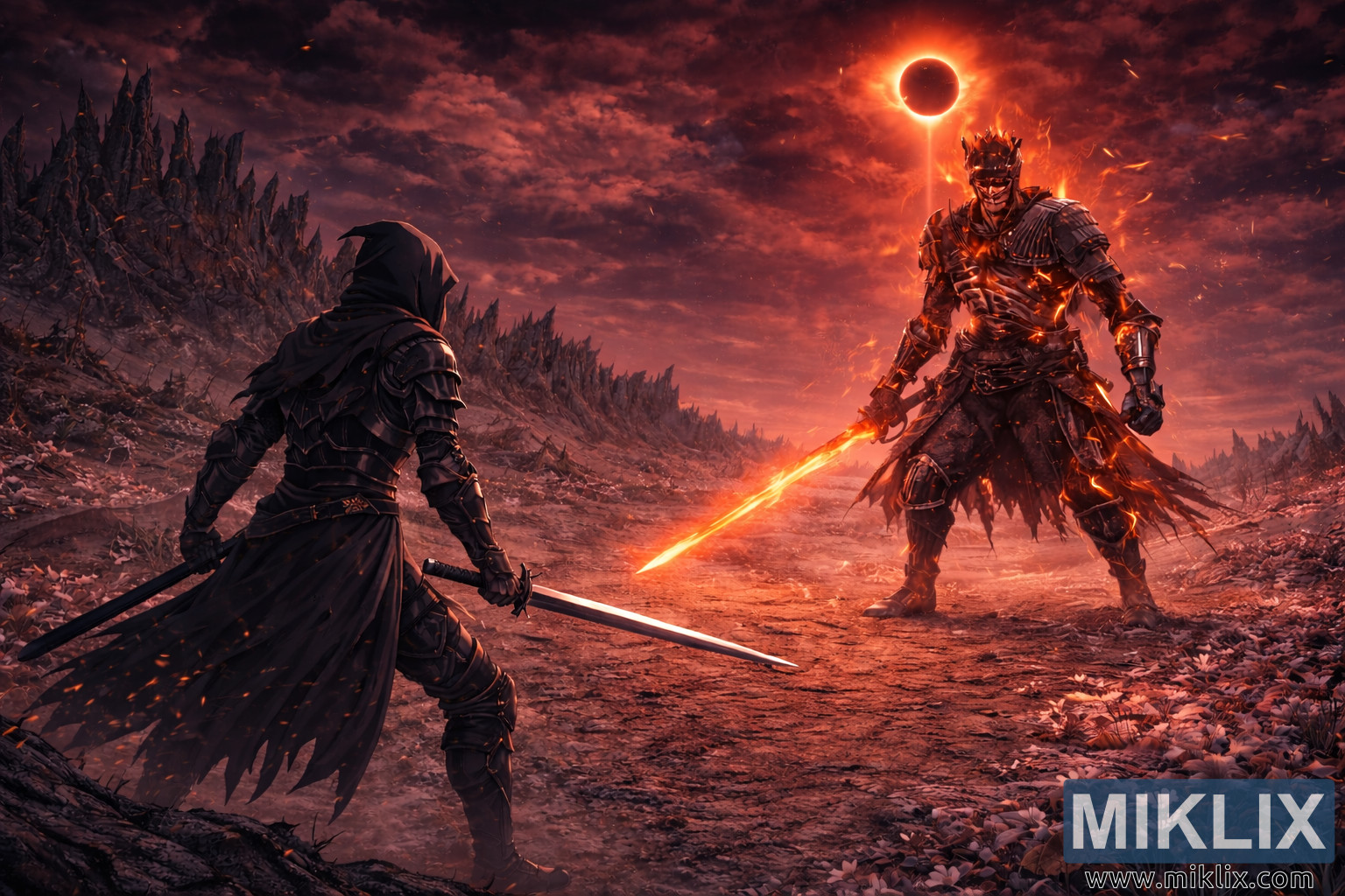 ಯುದ್ಧಕ್ಕೆ ಸ್ವಲ್ಪ ಮೊದಲು ಸುಟ್ಟ ಪಾಳುಭೂಮಿಯಲ್ಲಿ ಉರಿಯುತ್ತಿರುವ ಗ್ರಹಣದ ಕೆಳಗೆ ಎತ್ತರದ ಕರಗಿದ ನೈಟ್ ಅನ್ನು ಎದುರಿಸುತ್ತಿರುವ ಕಪ್ಪು ಶಸ್ತ್ರಸಜ್ಜಿತ ಯೋಧನ ಸಿನಿಮೀಯ ಅನಿಮೆ ಚಿತ್ರಣ.