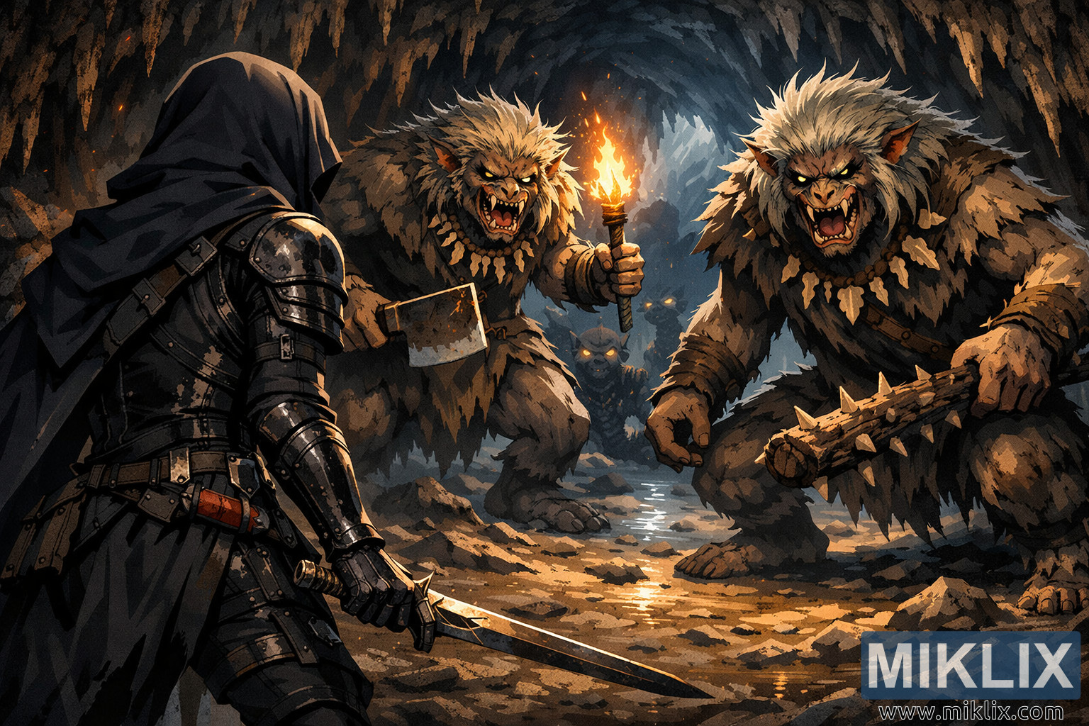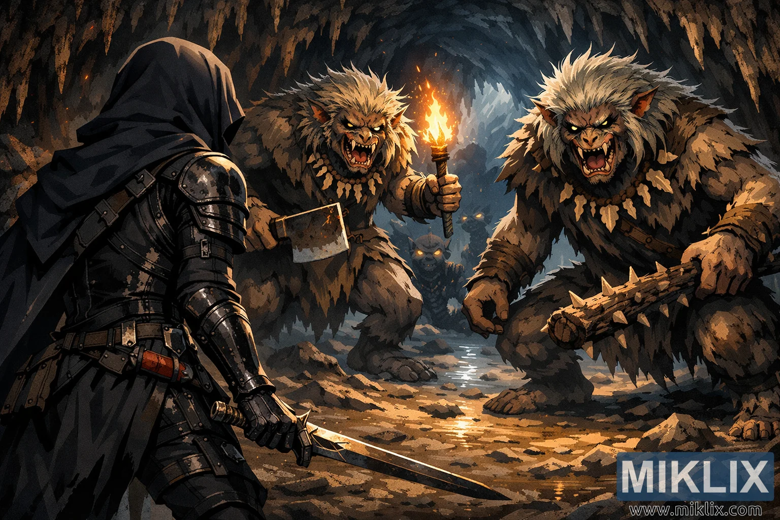 ಸಂಯೋಜನೆಯ ಬಲಭಾಗದಲ್ಲಿ ಪ್ರಾಬಲ್ಯ ಹೊಂದಿರುವ ಇಬ್ಬರು ಡೆಮಿ-ಹ್ಯೂಮನ್ ಚೀಫ್ಗಳು, ಎತ್ತರದ ಮತ್ತು ಸ್ನಾಯುಗಳಿಂದ ಕೂಡಿದ್ದು, ಅವರ ಗೂನು ಆಕಾರಗಳು ಮೊನಚಾದ ಬಂಡೆ ರಚನೆಗಳು ಮತ್ತು ತೊಟ್ಟಿಕ್ಕುವ ಸ್ಟ್ಯಾಲ್ಯಾಕ್ಟೈಟ್ಗಳಿಂದ ರೂಪುಗೊಂಡಿವೆ. ಅವರ ದೇಹವು ಮೃಗ ಮತ್ತು ಹುಮನಾಯ್ಡ್ ಗುಣಲಕ್ಷಣಗಳನ್ನು ಸಂಯೋಜಿಸುತ್ತದೆ, ಒರಟಾದ ತುಪ್ಪಳ ಮತ್ತು ಗಾಯದ ಚರ್ಮದಿಂದ ಆವೃತವಾಗಿದೆ. ಒಬ್ಬ ನಾಯಕ ಭಾರವಾದ, ಮೊನಚಾದ ಮರದ ಕೋಲನ್ನು ಹಿಡಿದಿದ್ದರೆ, ಇನ್ನೊಬ್ಬ ನಾಯಕ ಒಂದು ಕೈಯಲ್ಲಿ ಕಚ್ಚಾ ಸೀಳುಗಂಡಿಯನ್ನು ಮತ್ತು ಇನ್ನೊಂದು ಕೈಯಲ್ಲಿ ಉರಿಯುತ್ತಿರುವ ಟಾರ್ಚ್ ಅನ್ನು ಹಿಡಿದಿದ್ದಾನೆ. ಟಾರ್ಚ್ಲೈಟ್ ಅವರ ಗೊಣಗುವ ಮುಖಗಳಲ್ಲಿ ಬೆಚ್ಚಗಿನ, ಮಿನುಗುವ ಕಿತ್ತಳೆ ಬಣ್ಣಗಳನ್ನು ಬಿತ್ತರಿಸುತ್ತದೆ, ಹೊಳೆಯುವ ಕಣ್ಣುಗಳು, ತೀಕ್ಷ್ಣವಾದ ಕೋರೆಹಲ್ಲುಗಳು ಮತ್ತು ಆಕ್ರಮಣಶೀಲತೆ ಮತ್ತು ಎಚ್ಚರಿಕೆಯ ಬುದ್ಧಿವಂತಿಕೆ ಎರಡನ್ನೂ ಬಹಿರಂಗಪಡಿಸುವ ಅಭಿವ್ಯಕ್ತಿಶೀಲ ಹುಬ್ಬುಗಳನ್ನು ಒತ್ತಿಹೇಳುತ್ತದೆ. ಅವರ ನಿಲುವು ಅವರು ಕಳಂಕಿತರನ್ನು ಪ್ರತಿಯಾಗಿ ಅಳೆಯುವಷ್ಟೇ ಎಚ್ಚರಿಕೆಯಿಂದ ಅಳೆಯುತ್ತಿದ್ದಾರೆ ಎಂದು ಸೂಚಿಸುತ್ತದೆ. ಅವುಗಳ ನಡುವೆ, ಗುಹೆಯೊಳಗೆ ಆಳವಾಗಿ, ಹೊಳೆಯುವ ಕಣ್ಣುಗಳನ್ನು ಹೊಂದಿರುವ ಸಣ್ಣ ಜೀವಿಗಳ ಮಸುಕಾದ ಸಿಲೂಯೆಟ್ಗಳು ಕತ್ತಲೆಯಲ್ಲಿ ಅಡಗಿಕೊಂಡಿವೆ, ಆಳ ಮತ್ತು ಅಪಾಯವನ್ನು ಅತಿಕ್ರಮಿಸುವ ಪ್ರಜ್ಞೆಯನ್ನು ಸೇರಿಸುತ್ತವೆ.