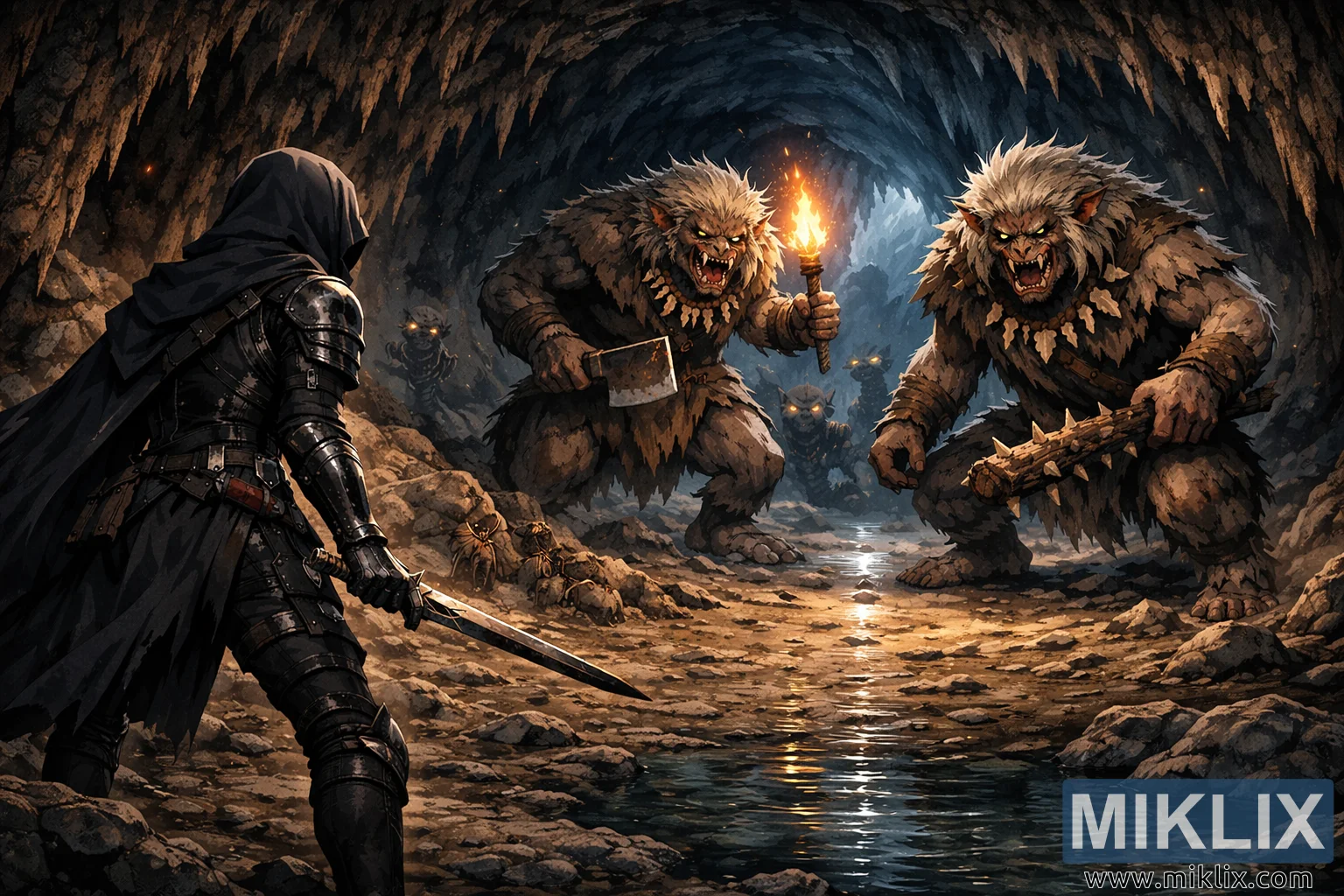 ದೃಶ್ಯದ ಮಧ್ಯ ಮತ್ತು ಬಲ ಭಾಗಗಳಲ್ಲಿ ಪ್ರಾಬಲ್ಯ ಹೊಂದಿರುವ ಇಬ್ಬರು ಡೆಮಿ-ಹ್ಯೂಮನ್ ಚೀಫ್ಗಳು, ಎತ್ತರದ ಮತ್ತು ಅಗಲವಾದ ಭುಜಗಳನ್ನು ಹೊಂದಿದ್ದಾರೆ, ಅವರ ಹಲ್ಕಿಂಗ್ ಸಿಲೂಯೆಟ್ಗಳು ಗುಹೆಯ ಆಳವಾದ ಹಿನ್ಸರಿತಗಳಿಂದ ರೂಪುಗೊಂಡಿವೆ. ಅವರ ದೇಹವು ಪ್ರಾಣಿಗಳ ತುಪ್ಪಳ, ಗಾಯದ ಚರ್ಮ ಮತ್ತು ಚೂಪಾದ ಹಲ್ಲುಗಳಿಂದ ತುಂಬಿದ ಉದ್ದವಾದ ದವಡೆಗಳೊಂದಿಗೆ ಮಾನವ ಸ್ನಾಯುಗಳನ್ನು ಸಂಯೋಜಿಸುತ್ತದೆ. ಒಬ್ಬ ಮುಖ್ಯಸ್ಥನು ಕಲ್ಲಿನ ಮೇಲ್ಮೈಗಳಾದ್ಯಂತ ಅಂಬರ್ ಬೆಳಕನ್ನು ಚೆಲ್ಲುವ ಉರಿಯುತ್ತಿರುವ ಟಾರ್ಚ್ ಅನ್ನು ಹಿಡಿದಿಟ್ಟುಕೊಳ್ಳುವಾಗ ಕಚ್ಚಾ ಸೀಲರ್ ಅನ್ನು ಎತ್ತುತ್ತಾನೆ, ಆದರೆ ಇನ್ನೊಬ್ಬ ಮುಖ್ಯಸ್ಥನು ಸ್ಪೈಕ್ಗಳಿಂದ ಕೂಡಿದ ಭಾರವಾದ ಮರದ ಕ್ಲಬ್ ಅನ್ನು ಝಳಪಿಸುತ್ತಾನೆ. ಅವರ ಹೊಳೆಯುವ ಹಳದಿ ಕಣ್ಣುಗಳು ಮತ್ತು ಗೊಣಗುವ ಅಭಿವ್ಯಕ್ತಿಗಳು ಆಕ್ರಮಣಶೀಲತೆ ಮತ್ತು ಎಚ್ಚರಿಕೆಯ ಬುದ್ಧಿವಂತಿಕೆ ಎರಡನ್ನೂ ತಿಳಿಸುತ್ತವೆ, ಇದು ಅವರು ಕುರುಡಾಗಿ ಚಾರ್ಜ್ ಮಾಡುವ ಬದಲು ತಮ್ಮ ಎದುರಾಳಿಯನ್ನು ಗಾತ್ರೀಕರಿಸುತ್ತಿದ್ದಾರೆ ಎಂದು ಸೂಚಿಸುತ್ತದೆ. ಅವುಗಳ ಹಿಂದೆ ಮತ್ತು ನಡುವೆ, ಎಳೆಯಲ್ಪಟ್ಟ ದೃಷ್ಟಿಕೋನವು ಹೆಚ್ಚುವರಿ ಗುಹೆಯ ಆಳವನ್ನು ಬಹಿರಂಗಪಡಿಸುತ್ತದೆ, ಅಲ್ಲಿ ಮಸುಕಾದ ಹೊಳೆಯುವ ಕಣ್ಣುಗಳನ್ನು ಹೊಂದಿರುವ ಸಣ್ಣ ನೆರಳಿನ ವ್ಯಕ್ತಿಗಳು ಅಡಗಿರುತ್ತಾರೆ, ಅಪಾಯ ಮತ್ತು ಪ್ರಮಾಣದ ಪ್ರಜ್ಞೆಯನ್ನು ಹೆಚ್ಚಿಸುತ್ತಾರೆ. ಖನಿಜ ವಿನ್ಯಾಸಗಳು, ನೇತಾಡುವ ಬೇರುಗಳು ಮತ್ತು ತೇವಾಂಶದ ಗೆರೆಗಳೊಂದಿಗೆ ಎತ್ತರದ ಗುಹೆಯ ಸೀಲಿಂಗ್ ಕಮಾನುಗಳು ದೃಶ್ಯ ಸಂಕೀರ್ಣತೆಯನ್ನು ಸೇರಿಸುತ್ತವೆ.