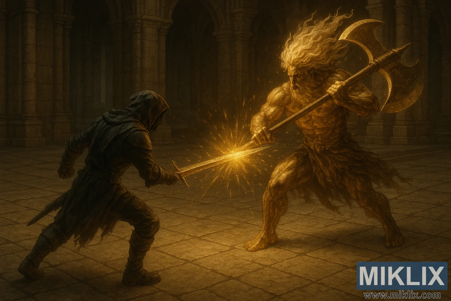 ಗಾಡ್ಫ್ರೇ ಒಂದು ಬೃಹತ್ ಡಬಲ್-ಬ್ಲೇಡ್ ಯುದ್ಧ ಕೊಡಲಿಯನ್ನು ಹಿಡಿದಿದ್ದಾನೆ, ಅದನ್ನು ಎರಡೂ ಕೈಗಳಿಂದ ಹ್ಯಾಫ್ಟ್ ಉದ್ದಕ್ಕೂ ಸರಿಯಾಗಿ ಹಿಡಿದಿದ್ದಾನೆ. ಆಯುಧವು ಕರ್ಣೀಯವಾಗಿ, ಮಧ್ಯ-ಸ್ವಿಂಗ್ ಅನ್ನು ಹೊಂದಿದೆ, ಆದ್ದರಿಂದ ಒಂದು ಅರ್ಧಚಂದ್ರಾಕಾರದ ಬ್ಲೇಡ್ ಘರ್ಷಣೆಯ ಕಡೆಗೆ ಕರೆದೊಯ್ಯುತ್ತದೆ ಮತ್ತು ವಿರುದ್ಧ ಬ್ಲೇಡ್ ಹಿಂದೆ ಹಿಂಬಾಲಿಸುತ್ತದೆ, ಆವೇಗ ಮತ್ತು ತೂಕವನ್ನು ಒತ್ತಿಹೇಳುತ್ತದೆ. ಕೊಡಲಿಯ ತಲೆಯನ್ನು ಕೆತ್ತಿದ ಮಾದರಿಗಳಿಂದ ಸಮೃದ್ಧವಾಗಿ ಅಲಂಕರಿಸಲಾಗಿದೆ ಮತ್ತು ಅದರ ಅಂಚುಗಳು ಪ್ರಕಾಶಮಾನವಾದ ಮತ್ತು ಮಾರಕವಾದ ಹರಿತವಾಗಿವೆ. ಕಳಂಕಿತರ ಕತ್ತಿ ಮತ್ತು ಕೊಡಲಿಯ ದಂಡದ ನಡುವಿನ ಸಂಪರ್ಕ ಬಿಂದುವು ಚಿನ್ನದ ಕಿಡಿಗಳ ಕೇಂದ್ರೀಕೃತ ಸ್ಫೋಟದಿಂದ ಗುರುತಿಸಲ್ಪಟ್ಟಿದೆ, ಎಲ್ಲಾ ದಿಕ್ಕುಗಳಲ್ಲಿಯೂ ಹೊರಕ್ಕೆ ಬೀಸುತ್ತದೆ. ಈ ಪ್ರಕಾಶಮಾನವಾದ ಬೆಳಕಿನ ಸ್ಫೋಟವು ಸಂಯೋಜನೆಯ ದೃಶ್ಯ ಮತ್ತು ವಿಷಯಾಧಾರಿತ ಕೇಂದ್ರವಾಗುತ್ತದೆ, ಇಬ್ಬರನ್ನೂ ಬೆಳಗಿಸುತ್ತದೆ ಮತ್ತು ಕಲ್ಲಿನ ನೆಲದಾದ್ಯಂತ ಬೆಚ್ಚಗಿನ ಪ್ರತಿಬಿಂಬಗಳನ್ನು ಬಿತ್ತರಿಸುತ್ತದೆ.