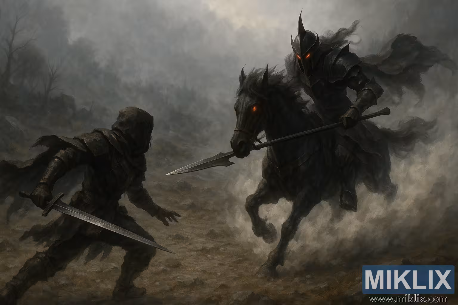 ಮಂಜು ತುಂಬಿದ ಪಾಳುಭೂಮಿಯಲ್ಲಿ ಚಾರ್ಜಿಂಗ್ ನೈಟ್ಸ್ ಕ್ಯಾವಲ್ರಿ ಸವಾರನಿಂದ ಟಾರ್ನಿಶ್ಡ್ ತಪ್ಪಿಸಿಕೊಳ್ಳುವ ಒಂದು ಅಸಹ್ಯಕರ, ವಾಸ್ತವಿಕ ಫ್ಯಾಂಟಸಿ ವರ್ಣಚಿತ್ರ, ಇದನ್ನು ಕಡಿಮೆ ಪಾರ್ಶ್ವ-ಕೋನೀಯ ನೋಟದಿಂದ ಸೆರೆಹಿಡಿಯಲಾಗಿದೆ.