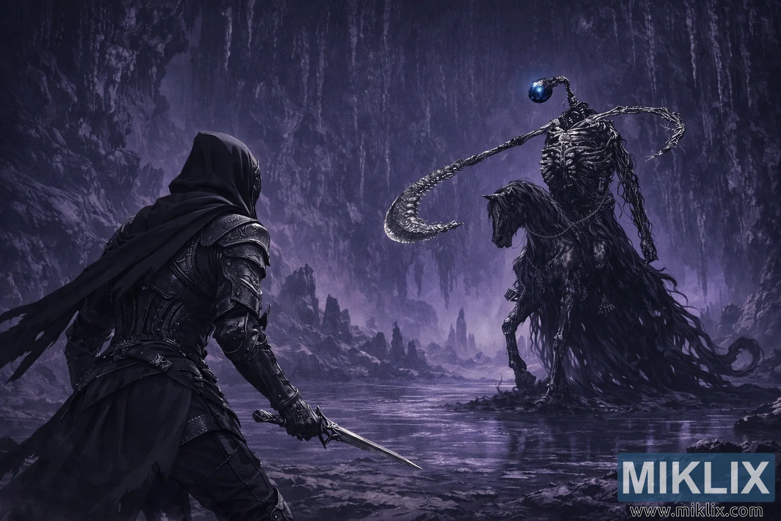 ಆಳವಿಲ್ಲದ, ಪ್ರತಿಫಲಿಸುವ ನೀರಿನ ವಿಶಾಲವಾದ ಪ್ರದೇಶದಾದ್ಯಂತ, ದಪ್ಪ, ಟಾರ್ ತರಹದ ಕೆಸರಿನಲ್ಲಿ ಕರಗುತ್ತಿರುವಂತೆ ಕಾಣುವ ಕೊಳೆಯುತ್ತಿರುವ ಕುದುರೆಯ ಮೇಲೆ ಕುಳಿತಿರುವ ಪುಟ್ರೆಸೆಂಟ್ ನೈಟ್ ನಿಂತಿದ್ದಾನೆ. ಜೀವಿಯ ಪಕ್ಕೆಲುಬಿನ ಮುಂಡವು ಕುದುರೆಯ ಮೇಲೆ ವಿಲಕ್ಷಣ ಪ್ರತಿಮೆಯಂತೆ ಏರುತ್ತದೆ, ಸ್ನಾಯುಗಳು ಮತ್ತು ಕಪ್ಪು ಬಣ್ಣದ ಅಸ್ಥಿರಜ್ಜುಗಳು ಅದರ ಚೌಕಟ್ಟಿನಿಂದ ಸಡಿಲವಾಗಿ ನೇತಾಡುತ್ತವೆ. ಒಂದು ಉದ್ದವಾದ ತೋಳು ಬೃಹತ್, ಅರ್ಧಚಂದ್ರಾಕಾರದ ಕುಡುಗೋಲು ಬ್ಲೇಡ್ನಲ್ಲಿ ಕೊನೆಗೊಳ್ಳುತ್ತದೆ, ಲೋಹದ ಮೊನಚಾದ ಮತ್ತು ಅಸಮ, ಮೌನ ಬೆದರಿಕೆಯಲ್ಲಿ ನಿಂತಿದೆ. ನೈಟ್ನ ದೇಹದ ಮೇಲ್ಭಾಗದಿಂದ ಬಾಗಿದ ಕಾಂಡವನ್ನು ವಿಸ್ತರಿಸಲಾಗುತ್ತದೆ, ಹೊಳೆಯುವ ನೀಲಿ ಗೋಳದಿಂದ ಕಿರೀಟವನ್ನು ಹೊಂದಿದ್ದು ಅದು ಅದರ ಕಣ್ಣು ಅಥವಾ ಆತ್ಮವಾಗಿ ಕಾರ್ಯನಿರ್ವಹಿಸುತ್ತದೆ, ಯುದ್ಧಭೂಮಿಯಾದ್ಯಂತ ಶೀತ, ರೋಹಿತದ ಬೆಳಕನ್ನು ಬಿತ್ತರಿಸುತ್ತದೆ.