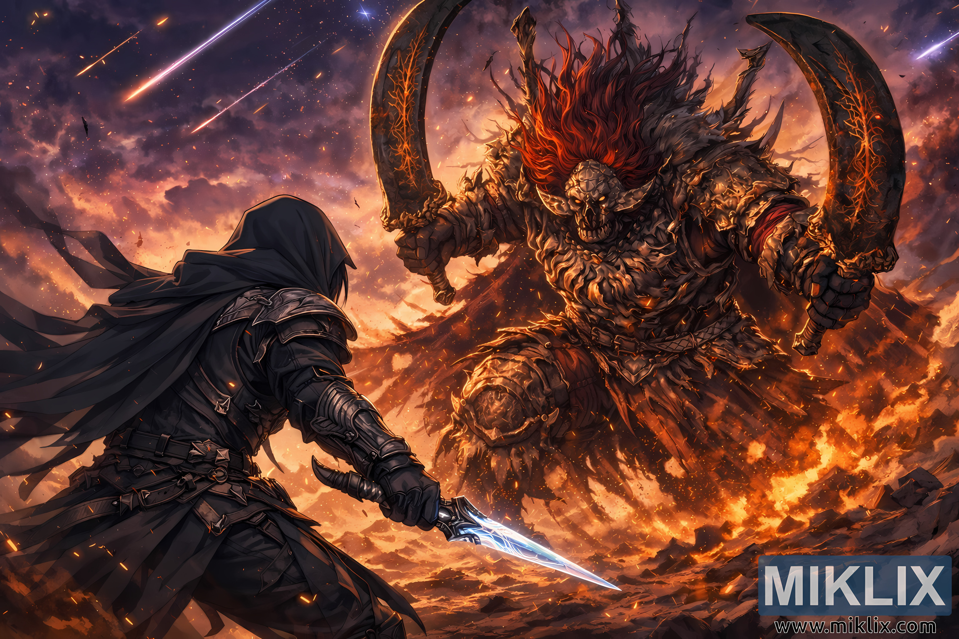 ಉಲ್ಕೆಗಳಿಂದ ತುಂಬಿದ ಆಕಾಶದ ಅಡಿಯಲ್ಲಿ ಉರಿಯುತ್ತಿರುವ ಯುದ್ಧಭೂಮಿಯಲ್ಲಿ ಸ್ಟಾರ್ಸ್ಕೋರ್ಜ್ ರಾಡಾನ್ ಅನ್ನು ಎದುರಿಸುವ ಟಾರ್ನಿಶ್ಡ್ನ ಎಪಿಕ್ ಎಲ್ಡನ್ ರಿಂಗ್ ಅನಿಮೆ ಫ್ಯಾನ್ ಆರ್ಟ್.