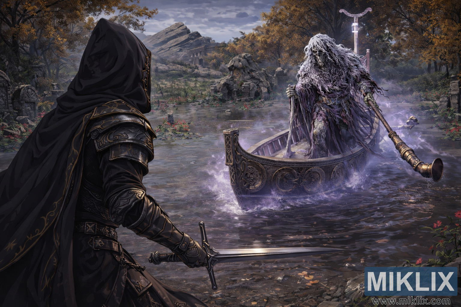 ಚೌಕಟ್ಟಿನ ಬಲಭಾಗದ ಮಧ್ಯಭಾಗದಲ್ಲಿರುವ ಆಳವಿಲ್ಲದ ನೀರಿನ ಉದ್ದಕ್ಕೂ, ಜೌಗು ಪ್ರದೇಶದ ಮೇಲ್ಮೈ ಮೇಲೆ ಅಸ್ವಾಭಾವಿಕವಾಗಿ ಜಾರಿದಂತೆ ಕಾಣುವ ಕಿರಿದಾದ ಮರದ ದೋಣಿಯಿಂದ ಏರುತ್ತಿರುವ ವಿಚಿತ್ರ ಅಸ್ಥಿಪಂಜರ ನಾವಿಕ ನಿಂತಿದ್ದಾನೆ. ಆ ಆಕೃತಿಯು ನೇರಳೆ ಮತ್ತು ಬೂದು ಬಣ್ಣದ ಛಾಯೆಗಳಿಂದ ಕೂಡಿದ ಹರಿದ ನಿಲುವಂಗಿಗಳಲ್ಲಿ ಹೊದಿಸಲ್ಪಟ್ಟಿದೆ, ಅವುಗಳ ಅಂಚುಗಳು ರೋಹಿತದ ಮಂಜಿನ ತುಂಡುಗಳಾಗಿ ಕರಗುತ್ತವೆ. ತಲೆಬುರುಡೆಯಂತಹ ಮುಖದ ಸುತ್ತಲೂ ಉದ್ದವಾದ, ಅವ್ಯವಸ್ಥೆಯ ಬಿಳಿ ಕೂದಲು ಬೀಳುತ್ತದೆ, ಅದರ ಟೊಳ್ಳಾದ ಕಣ್ಣಿನ ಕುಳಿಗಳು ಮಸುಕಾದ ಹೊಳಪಿನಿಂದ ಮಸುಕಾದ ಹೊಳಪಿನಿಂದ ಹೊಳೆಯುತ್ತವೆ. ನಾವಿಕನು ವಿಧ್ಯುಕ್ತ ಕೋಲಿನ ಆಕಾರದ ಉದ್ದವಾದ ಹುಟ್ಟನ್ನು ಹಿಡಿಯುತ್ತಾನೆ, ಅದರ ಲೋಹದ ತುದಿಯು ದೋಣಿಯ ಸುತ್ತಲೂ ಸೂಕ್ಷ್ಮವಾದ ನೇರಳೆ ಪ್ರಭಾವಲಯವು ಹೊರಹೊಮ್ಮುವಾಗ ಮಸುಕಾದ ಮುಖ್ಯಾಂಶಗಳನ್ನು ಸೆರೆಹಿಡಿಯುತ್ತದೆ. ಈ ಅಲೌಕಿಕ ಹೊಳಪು ನೀರನ್ನು ತೊಂದರೆಗೊಳಿಸುತ್ತದೆ, ಪ್ರಕಾಶಮಾನವಾದ ಅಲೆಗಳು ಮತ್ತು ಸೌಮ್ಯವಾದ ಸ್ಪ್ಲಾಶ್ಗಳನ್ನು ಸೃಷ್ಟಿಸುತ್ತದೆ, ಅದು ಇಲ್ಲದಿದ್ದರೆ ಸ್ಥಿರ ಮೇಲ್ಮೈಯನ್ನು ಮುರಿಯುತ್ತದೆ.