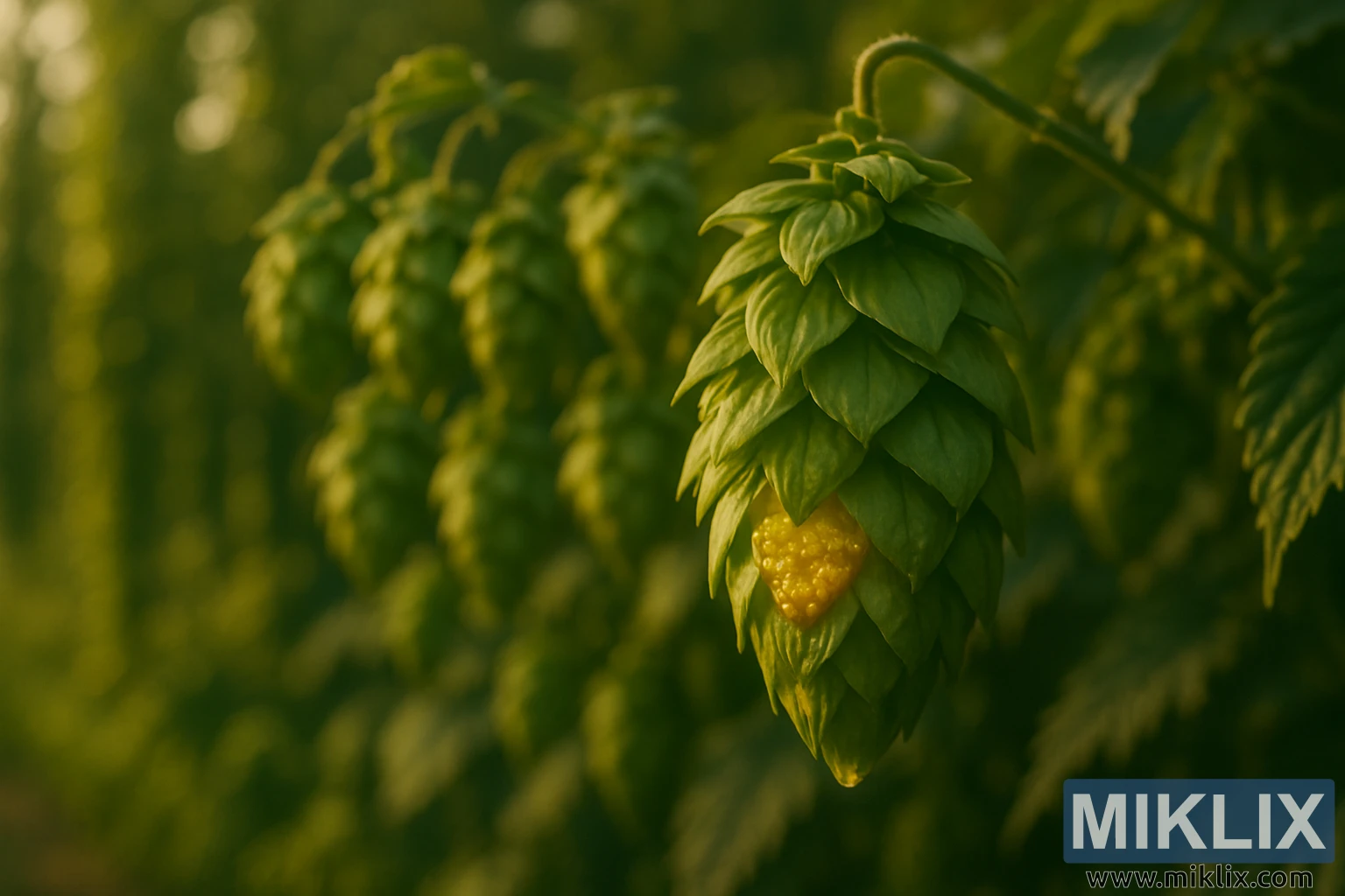 ಈ ಛಾಯಾಚಿತ್ರವು ಬ್ಲಾಟೊ ಹಾಪ್ ಕೋನ್ಗಳ ಸಮೃದ್ಧ ಸಸ್ಯಶಾಸ್ತ್ರೀಯ ಸೌಂದರ್ಯವನ್ನು ಬೆಚ್ಚಗಿನ, ಚಿನ್ನದ ಬೆಳಕಿನಲ್ಲಿ ಪ್ರದರ್ಶಿಸಲಾದ ಹಚ್ಚ ಹಸಿರಿನ ಹಾಪ್ ಕ್ಷೇತ್ರದಲ್ಲಿ ಸೆರೆಹಿಡಿಯುತ್ತದೆ. ಚಿತ್ರದ ಮುಂಚೂಣಿಯಲ್ಲಿ, ಒಂದು ಏಕ ಹಾಪ್ ಕೋನ್ ಸಂಯೋಜನೆಯ ಮೇಲೆ ಪ್ರಾಬಲ್ಯ ಸಾಧಿಸುತ್ತದೆ, ಅದರ ಬಳ್ಳಿಯಿಂದ ಆಕರ್ಷಕವಾಗಿ ನೇತಾಡುತ್ತದೆ. ಇದರ ರಚನೆಯು ತೀಕ್ಷ್ಣವಾಗಿ ಕೇಂದ್ರೀಕೃತವಾಗಿದೆ, ಅದರ ವಿಶಿಷ್ಟ ಶಂಕುವಿನಾಕಾರದ ಆಕಾರವನ್ನು ರೂಪಿಸುವ ಅತಿಕ್ರಮಿಸುವ ಬ್ರಾಕ್ಟ್ಗಳ ಸಂಕೀರ್ಣ ಪದರಗಳನ್ನು ಪ್ರದರ್ಶಿಸುತ್ತದೆ. ಕಾಗದದ ಹಸಿರು ಬ್ರಾಕ್ಟ್ಗಳು ಅವುಗಳ ಅಂಚುಗಳಲ್ಲಿ ಸ್ವಲ್ಪ ಹೊರಕ್ಕೆ ಸುರುಳಿಯಾಗಿ, ಒಳಗೆ ನೆಲೆಗೊಂಡಿರುವ ಚಿನ್ನದ ಲುಪುಲಿನ್ ಗ್ರಂಥಿಗಳ ನೋಟವನ್ನು ಬಹಿರಂಗಪಡಿಸುತ್ತವೆ. ಈ ರಾಳದ ಗ್ರಂಥಿಗಳು ಮೇಣದ ಹೊಳಪಿನಿಂದ ಹೊಳೆಯುತ್ತವೆ, ಅವುಗಳ ಹರಳಿನ ವಿನ್ಯಾಸವು ಸುತ್ತಮುತ್ತಲಿನ ಬ್ರಾಕ್ಟ್ಗಳ ನಯವಾದ, ನಾಳೀಯ ಮೇಲ್ಮೈಗಳಿಗೆ ಸಂಪೂರ್ಣವಾಗಿ ವ್ಯತಿರಿಕ್ತವಾಗಿ ಎದ್ದು ಕಾಣುತ್ತದೆ. ಈ ವಿವರವು ಹಾಪ್ನ ಕೃಷಿ ಉತ್ಪನ್ನ ಮತ್ತು ತಯಾರಿಕೆಯಲ್ಲಿ ಪ್ರಮುಖ ಘಟಕಾಂಶವಾಗಿದೆ ಎಂದು ಒತ್ತಿಹೇಳುತ್ತದೆ, ಅಲ್ಲಿ ಲುಪುಲಿನ್ ಬಿಯರ್ನಲ್ಲಿ ಕಹಿ, ಸುವಾಸನೆ ಮತ್ತು ರುಚಿಗೆ ಕೊಡುಗೆ ನೀಡುತ್ತದೆ.