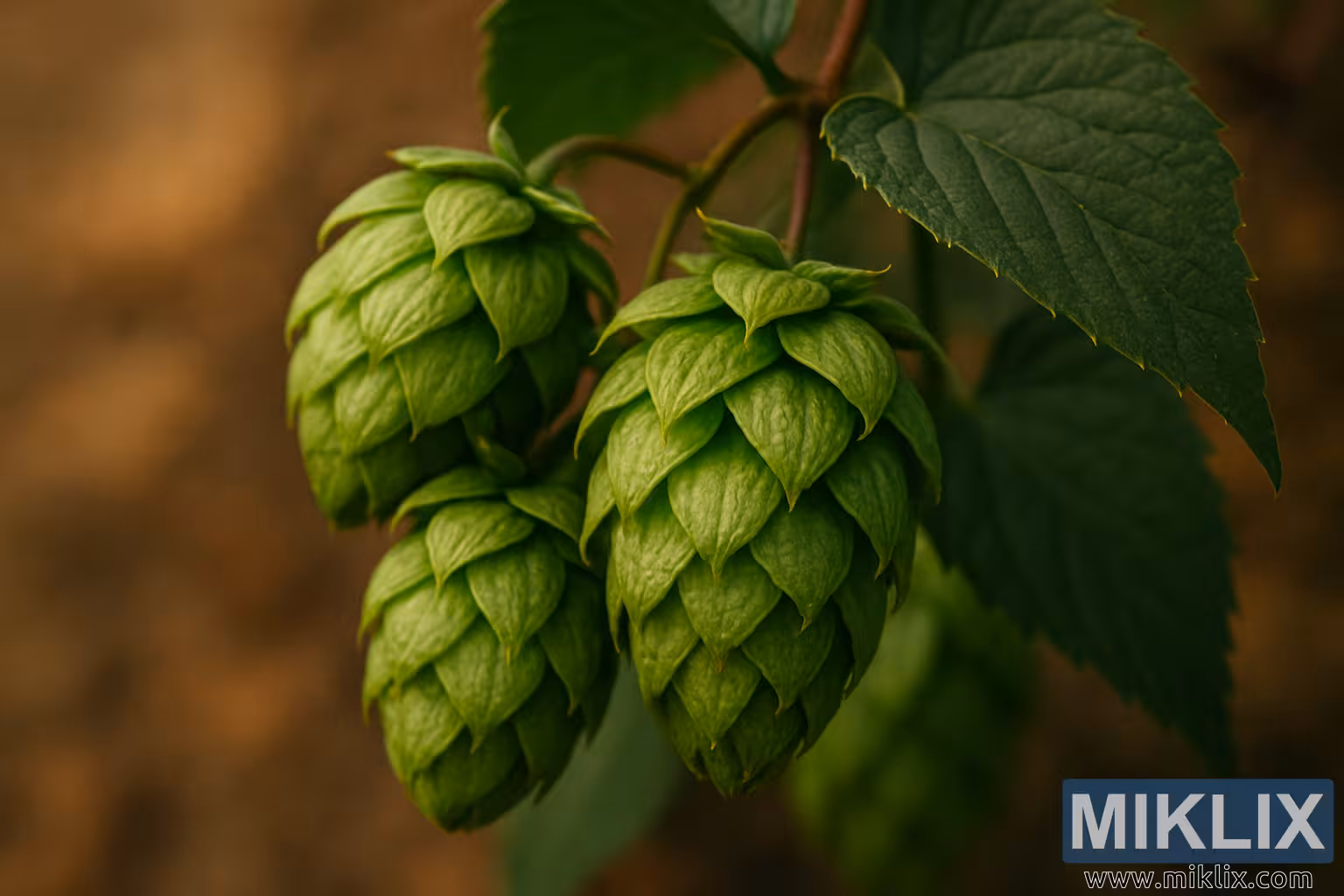 ಹಾಪ್ ಕೋನ್ಗಳ ಸುತ್ತಲೂ ಹಲವಾರು ಅಗಲವಾದ, ಕಡು ಹಸಿರು ಎಲೆಗಳು ಆಳವಾಗಿ ದಂತುರೀಕೃತ ಅಂಚುಗಳನ್ನು ಹೊಂದಿದ್ದು, ಅವುಗಳ ಮಧ್ಯದ ಮಧ್ಯನಾಳಗಳಿಂದ ಹೊರಹೊಮ್ಮುವ ಪ್ರಮುಖ ನಾಳಗಳು ಇರುತ್ತವೆ. ಎಲೆಗಳು ಕೋನ್ಗಳನ್ನು ನೈಸರ್ಗಿಕವಾಗಿ ಫ್ರೇಮ್ ಮಾಡುತ್ತವೆ ಮತ್ತು ಆಕಾರ ಮತ್ತು ಸ್ವರದ ಆಕರ್ಷಕ ವ್ಯತಿರಿಕ್ತತೆಯನ್ನು ಸೇರಿಸುತ್ತವೆ: ಅವುಗಳ ಚಪ್ಪಟೆಯಾದ, ಕೋನೀಯ ಪ್ರೊಫೈಲ್ಗಳು ಕೋನ್ಗಳ ದುಂಡಾದ, ಪದರಗಳ ಜ್ಯಾಮಿತಿಯನ್ನು ಸರಿದೂಗಿಸುತ್ತವೆ. ಮೇಲಿನ ಬಲ ಮೂಲೆಯಲ್ಲಿರುವ ಒಂದು ಎಲೆಯು ಬೆಳಕನ್ನು ಹೆಚ್ಚು ನೇರವಾಗಿ ಸೆರೆಹಿಡಿಯುತ್ತದೆ, ಮ್ಯಾಟ್ ಮೇಲ್ಮೈ ವಿನ್ಯಾಸ ಮತ್ತು ಎತ್ತರದ ಸಿರೆಗಳ ನಡುವೆ ಸೂಕ್ಷ್ಮ ನೆರಳುಗಳನ್ನು ಬಹಿರಂಗಪಡಿಸುತ್ತದೆ. ಇದಕ್ಕೆ ವಿರುದ್ಧವಾಗಿ, ಇತರ ಎಲೆಗಳು ಮೃದುವಾದ ನೆರಳಿನಲ್ಲಿ ಹಿಮ್ಮೆಟ್ಟುತ್ತವೆ, ಕೇಂದ್ರ ಕೋನ್ಗಳ ಮೇಲೆ ಗಮನವನ್ನು ಕೇಂದ್ರೀಕರಿಸಲು ಸಹಾಯ ಮಾಡುತ್ತದೆ.