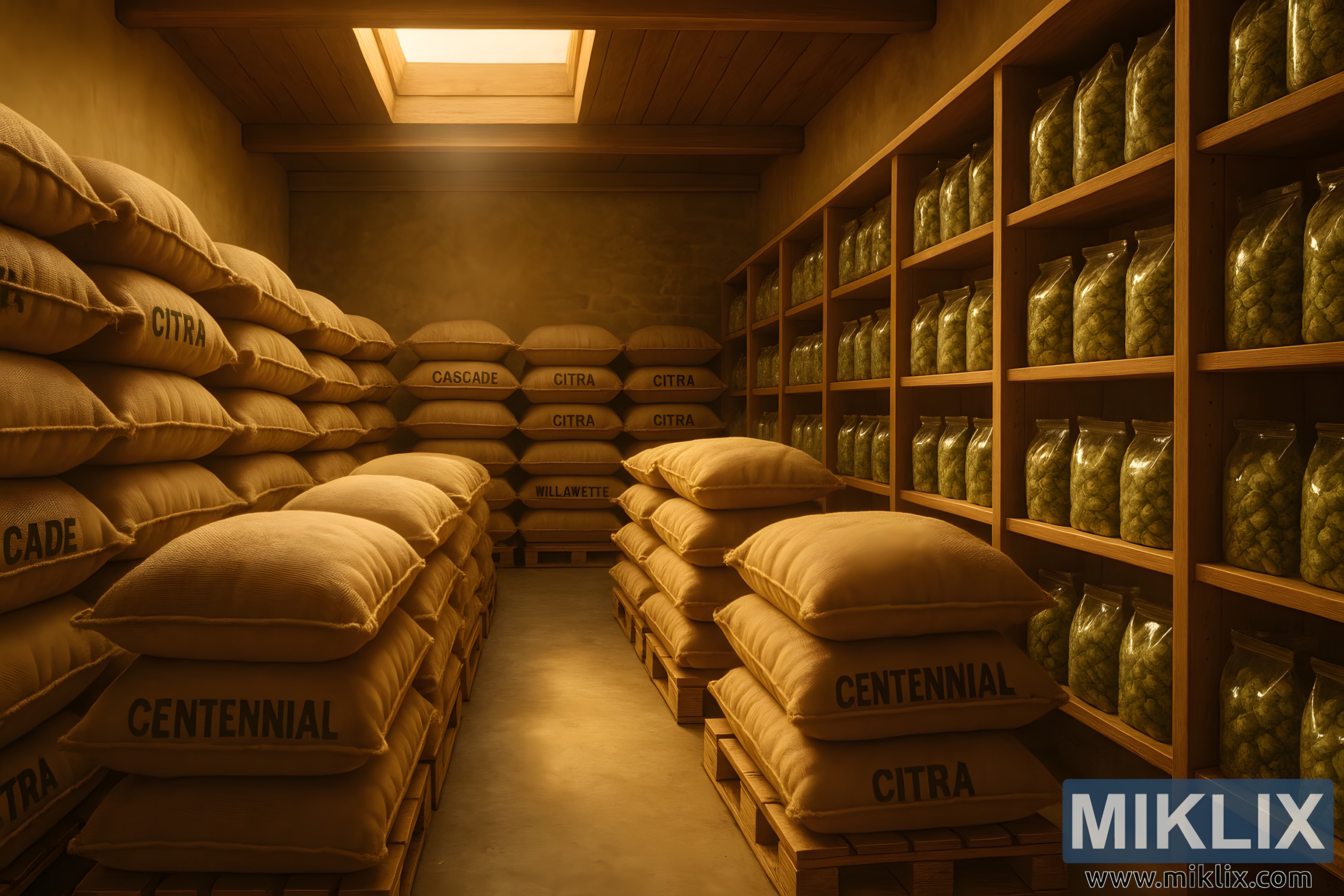 ಬರ್ಲ್ಯಾಪ್ ಚೀಲಗಳು ಮತ್ತು ಒಣಗಿದ ಹಾಪ್ಗಳ ಕಪಾಟುಗಳನ್ನು ಹೊಂದಿರುವ ತಾಪಮಾನ-ನಿಯಂತ್ರಿತ ಹಾಪ್ ಶೇಖರಣಾ ಕೊಠಡಿ, ಚಿನ್ನದ ಬೆಳಕಿನಲ್ಲಿ ಸ್ನಾನ ಮಾಡಲ್ಪಟ್ಟಿದೆ, ಕುದಿಸುವ ಸುವಾಸನೆಯನ್ನು ಸಂರಕ್ಷಿಸುವಲ್ಲಿ ಕಾಳಜಿಯನ್ನು ಒತ್ತಿಹೇಳುತ್ತದೆ.