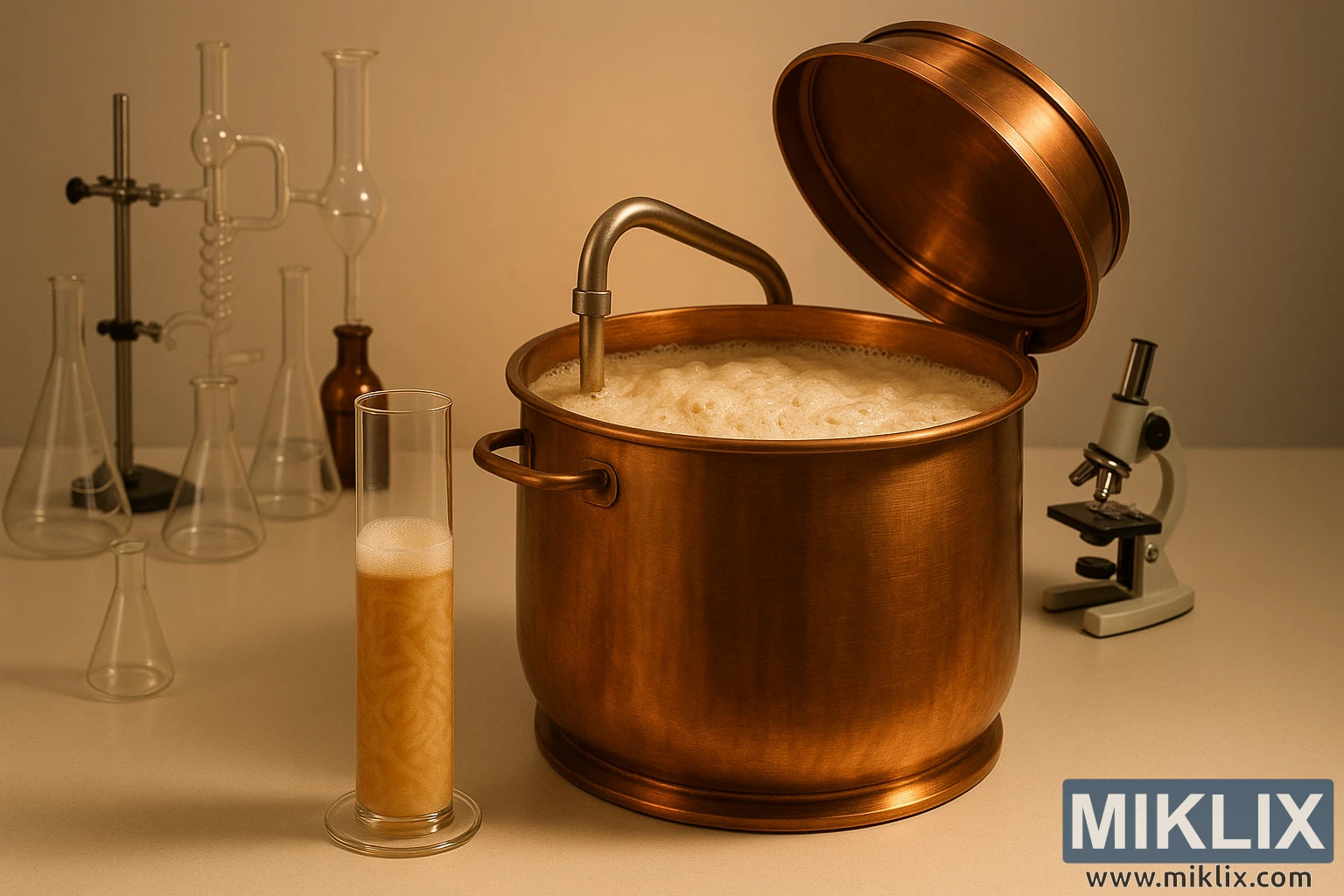 ಫೋಮಿಂಗ್ ದ್ರವದಿಂದ ತುಂಬಿದ ತಾಮ್ರದ ಬ್ರೂ ಕೆಟಲ್, ಯೀಸ್ಟ್ ಸ್ಲರಿಯ ಪದವಿ ಪಡೆದ ಸಿಲಿಂಡರ್ ಮತ್ತು ಬೆಚ್ಚಗಿನ ಚಿನ್ನದ ಬೆಳಕಿನಲ್ಲಿ ಸುತ್ತಮುತ್ತಲಿನ ವೈಜ್ಞಾನಿಕ ಉಪಕರಣಗಳನ್ನು ಹೊಂದಿರುವ ವೃತ್ತಿಪರ ಬ್ರೂಯಿಂಗ್ ಪ್ರಯೋಗಾಲಯದ ದೃಶ್ಯ.