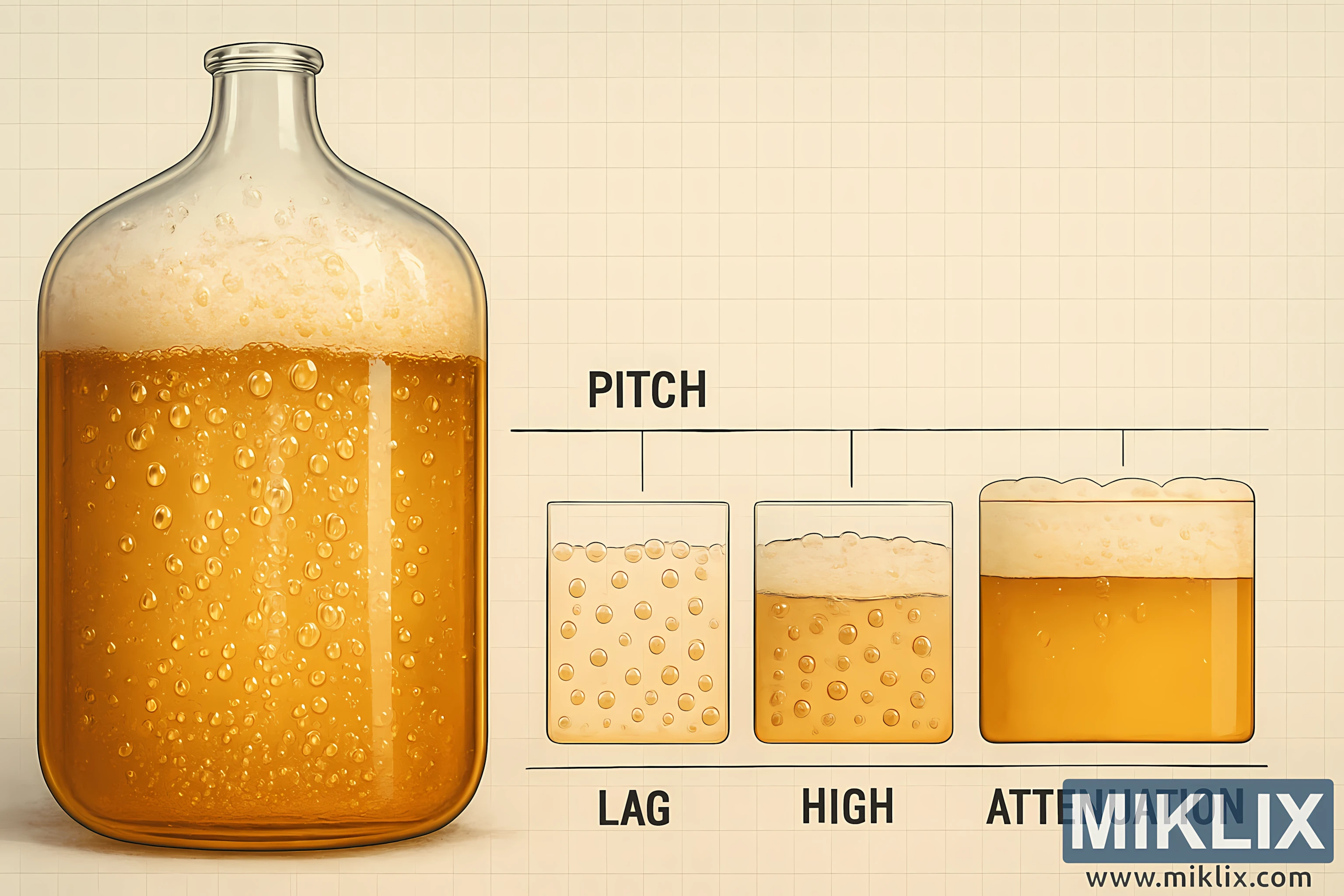 ಮಧ್ಯದ ಕಡೆಗೆ ಚಲಿಸುವಾಗ, ವಿವರಣೆಯು ರಚನಾತ್ಮಕ ಹುದುಗುವಿಕೆಯ ಕಾಲಮಾನಕ್ಕೆ ಪರಿವರ್ತನೆಗೊಳ್ಳುತ್ತದೆ. ನಾಲ್ಕು ವಿಭಿನ್ನ ಹಂತಗಳು - ಪಿಚ್, ಲಾಗ್, ಹೈ ಕ್ರೇಯುಸೆನ್ ಮತ್ತು ಅಟೆನ್ಯೂಯೇಷನ್ - ಅಡ್ಡಲಾಗಿ ಜೋಡಿಸಲಾದ ಪ್ರತ್ಯೇಕ, ಸರಳೀಕೃತ ಗಾಜಿನ ಪಾತ್ರೆಗಳಲ್ಲಿ ಚಿತ್ರಿಸಲಾಗಿದೆ. ಪ್ರತಿಯೊಂದು ಹಂತವನ್ನು ವೈಜ್ಞಾನಿಕ ರೇಖಾಚಿತ್ರಗಳನ್ನು ನೆನಪಿಸುವ ನಿಖರವಾದ, ಶುದ್ಧ ಮುದ್ರಣಕಲೆಯೊಂದಿಗೆ ಸ್ಪಷ್ಟವಾಗಿ ಲೇಬಲ್ ಮಾಡಲಾಗಿದೆ. "ಪಿಚ್" ಹಂತವು ಕನಿಷ್ಠ ಫೋಮ್ ಹೊಂದಿರುವ ಪಾತ್ರೆ ಮತ್ತು ಆರಂಭಿಕ ಗುಳ್ಳೆಗಳು ರೂಪುಗೊಳ್ಳುವುದನ್ನು ತೋರಿಸುತ್ತದೆ. "ಲ್ಯಾಗ್" ಹಂತವು ಗುಳ್ಳೆ ಚಟುವಟಿಕೆಯಲ್ಲಿ ಸ್ವಲ್ಪ ಹೆಚ್ಚಳವನ್ನು ವಿವರಿಸುತ್ತದೆ, ಇದು ಯೀಸ್ಟ್ನ ಆರಂಭಿಕ ಚಯಾಪಚಯ ಜಾಗೃತಿಯನ್ನು ಸೂಚಿಸುತ್ತದೆ. "ಹೈ ಕ್ರೇಯುಸೆನ್" ನಲ್ಲಿ, ದಪ್ಪವಾದ ಫೋಮ್ ಕ್ಯಾಪ್ ಮತ್ತು ತೀವ್ರಗೊಂಡ ಗುಳ್ಳೆ ಸಾಂದ್ರತೆಯು ಗರಿಷ್ಠ ಹುದುಗುವಿಕೆಯನ್ನು ವಿವರಿಸುತ್ತದೆ. ಅಂತಿಮವಾಗಿ, "ಅಟೆನ್ಯೂಯೇಷನ್" ಶಾಂತವಾದ ದ್ರವವನ್ನು ತೋರಿಸುತ್ತದೆ, ಇನ್ನೂ ಹೊರಹೊಮ್ಮುವ ಆದರೆ ನೆಲೆಗೊಳ್ಳುತ್ತದೆ, ಬಲವಾದ ಬಿಯರ್ ತರಹದ ಬಣ್ಣ ಮತ್ತು ಸಕ್ಕರೆ ಪರಿವರ್ತನೆಯ ಕ್ರಮೇಣ ಪೂರ್ಣಗೊಳ್ಳುವಿಕೆಯನ್ನು ಸೂಚಿಸುವ ಸ್ಥಿರವಾದ ಫೋಮ್ ಪದರದೊಂದಿಗೆ.
