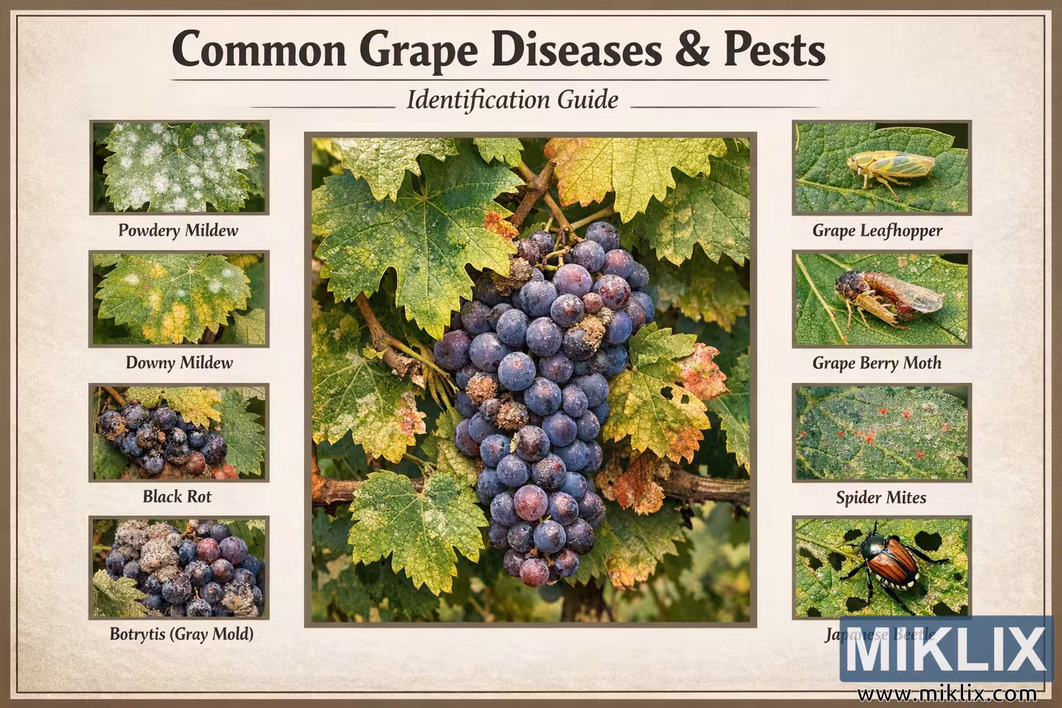 ಚಿತ್ರ: ದ್ರಾಕ್ಷಿಯಲ್ಲಿ ಕಂಡುಬರುವ ಸಾಮಾನ್ಯ ರೋಗಗಳು ಮತ್ತು ಕೀಟಗಳ ಗುರುತಿನ ಮಾರ್ಗದರ್ಶಿ