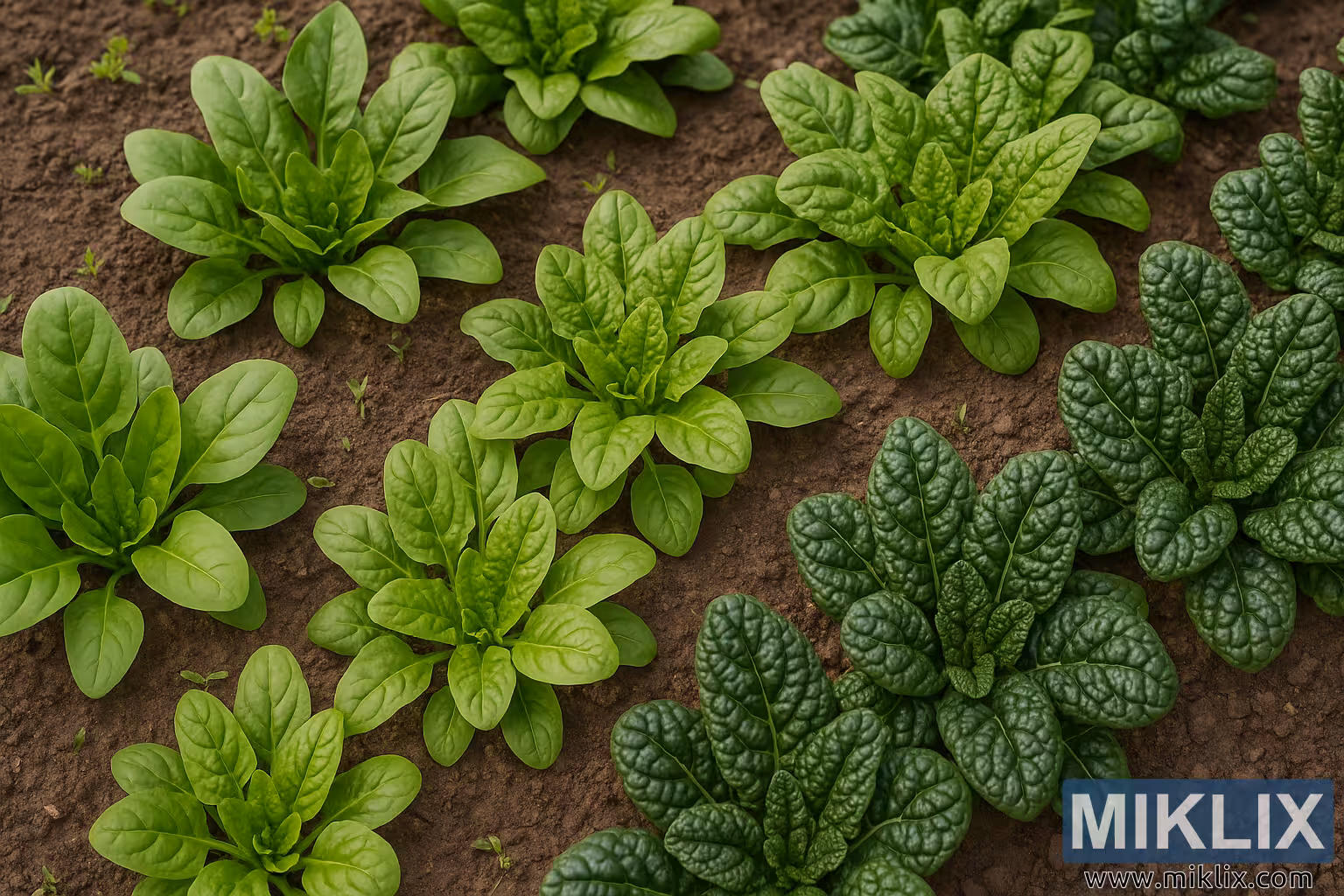 ಚೆನ್ನಾಗಿ ಬೆಳೆಸಿದ ಉದ್ಯಾನ ಹಾಸಿಗೆಯಲ್ಲಿ ಬೆಳೆಯುತ್ತಿರುವ ನಯವಾದ-ಎಲೆ, ಅರೆ-ಸವೊಯ್ ಮತ್ತು ಸವೊಯ್ ಪಾಲಕ್ ಪ್ರಭೇದಗಳನ್ನು ತೋರಿಸುವ ವಿವರವಾದ ಫೋಟೋ, ವಿಧಗಳ ನಡುವಿನ ವಿನ್ಯಾಸ ಮತ್ತು ಬಣ್ಣ ವ್ಯತ್ಯಾಸಗಳನ್ನು ವಿವರಿಸುತ್ತದೆ.