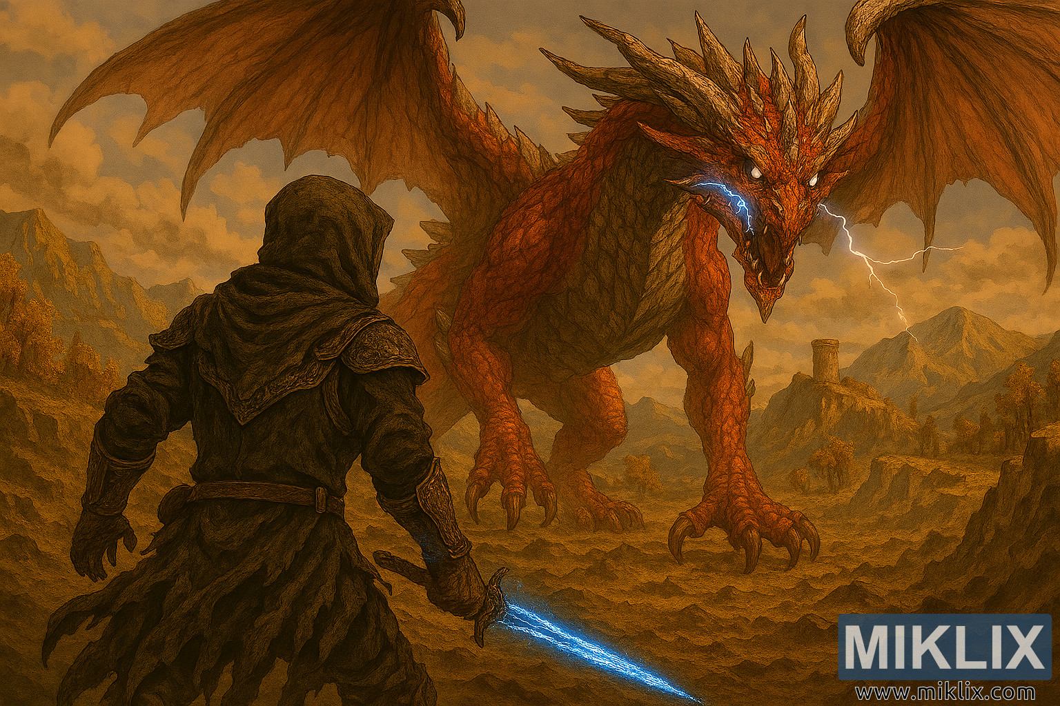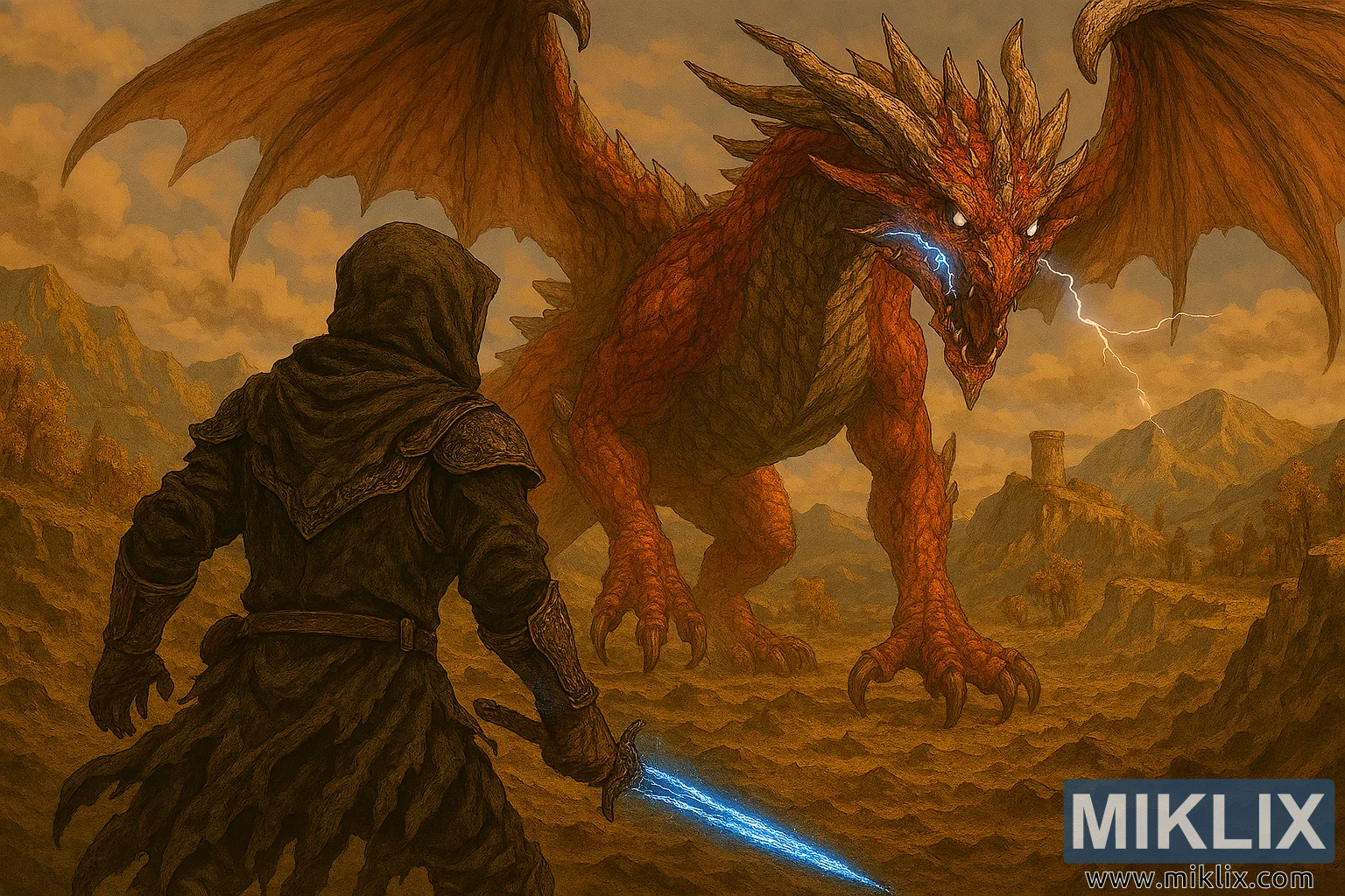 구도는 대각선으로 영화적인 느낌을 주며, 타락한 용과 란세악스는 화면을 사이에 두고 서로 마주 보고 있습니다. 빛나는 검과 번개는 시각적 중심 역할을 하며, 따뜻한 흙빛 풍경과 용의 붉은 비늘과 대비를 이룹니다. 섬세한 전경 질감과 약간 부드러운 배경을 통해 깊이감이 표현되어 사실감과 규모감을 더욱 강조합니다.