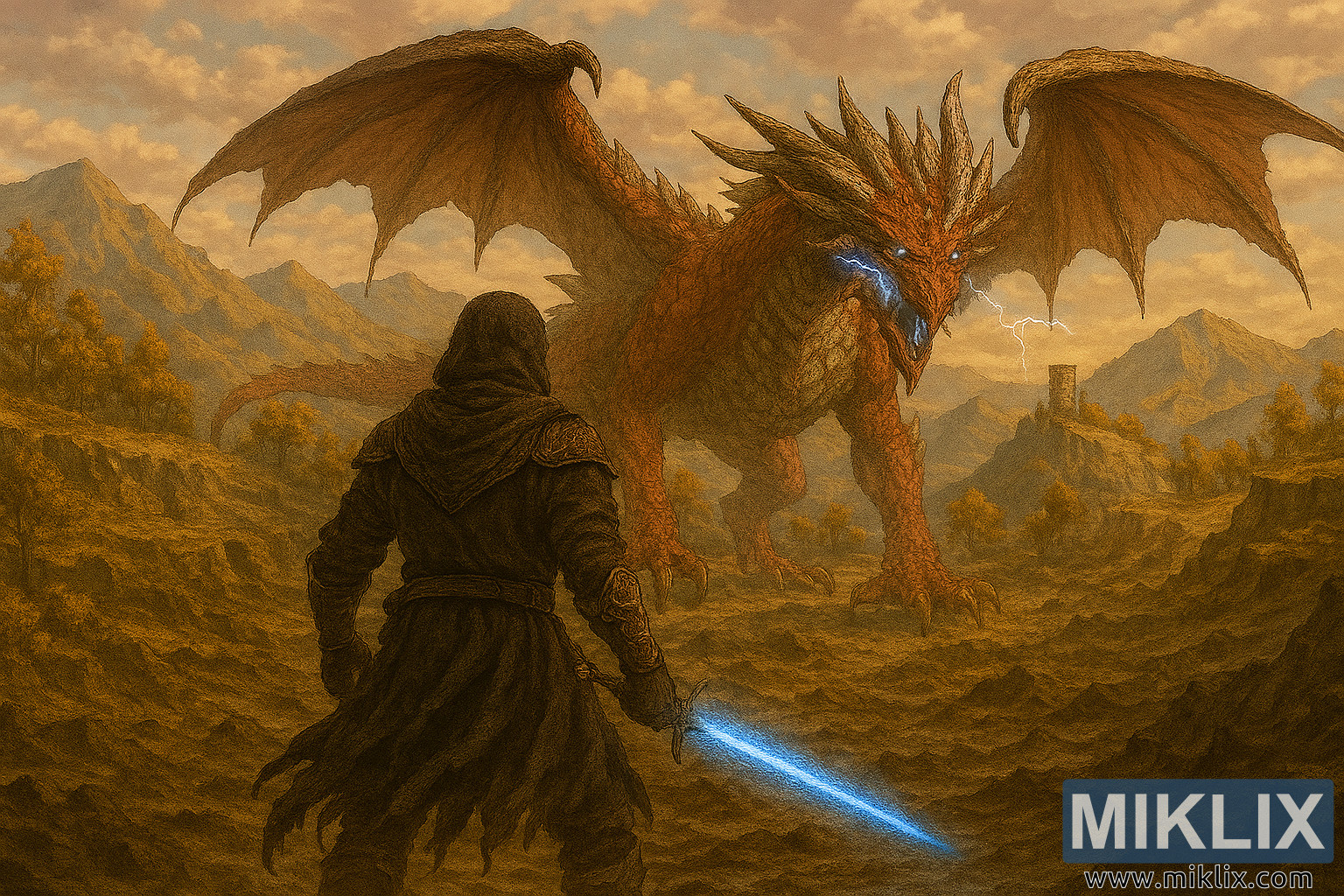 이 구도는 규모와 분위기를 강조합니다. 높은 앵글 덕분에 광활한 지형이 한눈에 들어오고, 타니시드와 란세악스는 화면 대각선 방향에 배치되어 있습니다. 빛나는 검과 번개는 시각적 중심 역할을 하며, 따뜻한 흙빛 풍경과 붉은 용의 비늘과 대비를 이룹니다. 섬세한 전경 질감과 부드러운 배경 요소들을 통해 깊이감이 표현되어 사실감과 몰입감을 높입니다.