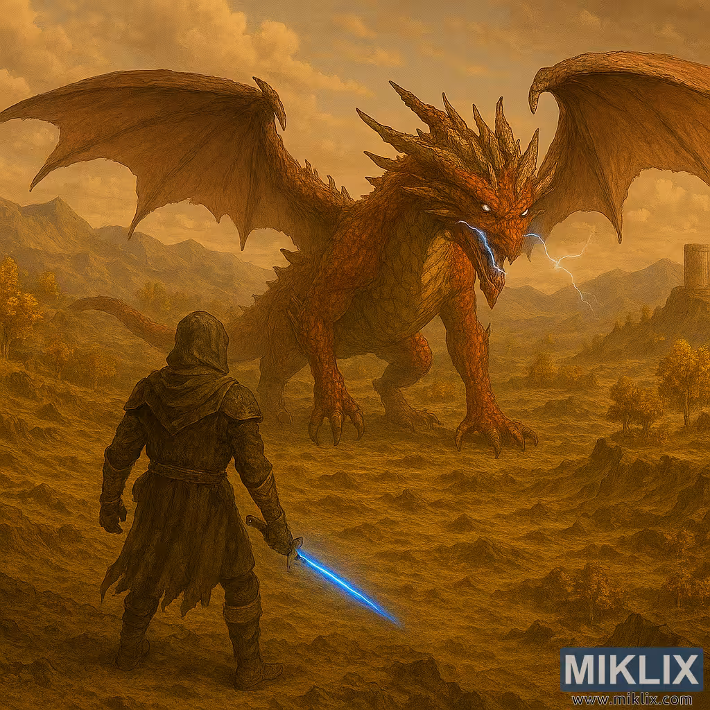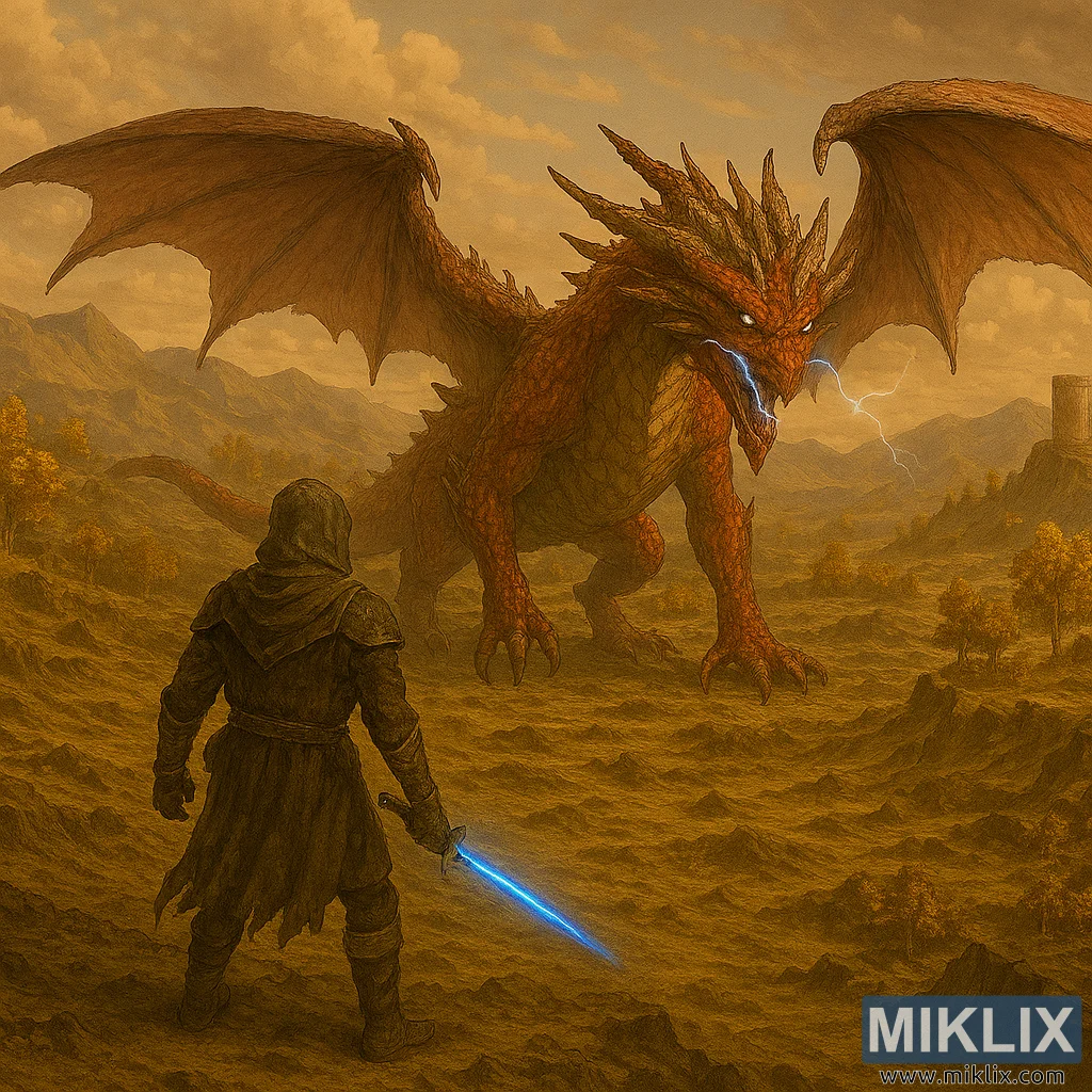 광활하고 반쯤 사실적인 디지털 회화 작품이 엘든 링의 알투스 고원에서 펼쳐지는 타락한 자와 고대 용 란세악스의 장대한 대결을 포착했습니다. 높은 곳에서 뒤로 물러난 듯한 등각 투영 시점으로 묘사된 이 작품은 황금빛 풍경의 전체 모습을 드러내며 규모, 분위기, 그리고 신화적인 긴장감을 강조합니다.