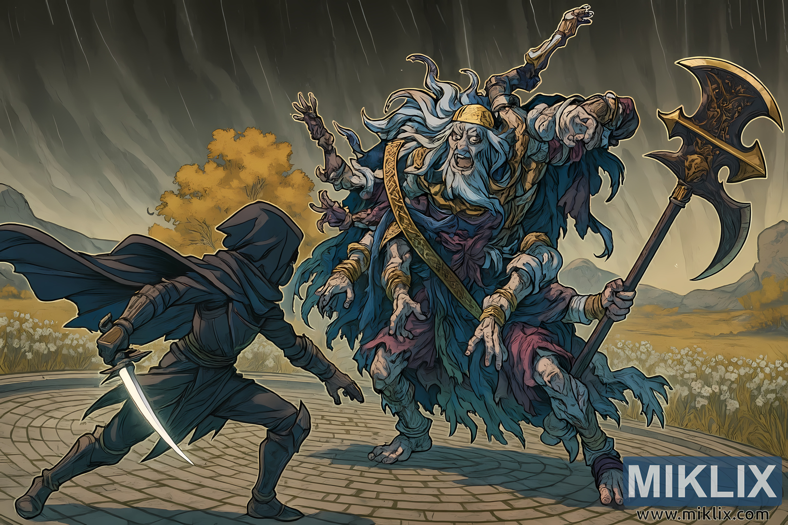 고드프루아는 한 손에 거대한 양날 도끼를 꽉 쥐고 있다. 화려하고 묵직한 이 무기는 어두운 금속 날에 복잡한 문양이 새겨져 있으며, 마치 휘두르는 도중이거나 상대를 내리치기 직전인 듯 각도를 이루고 있다. 타니시드와 고드프루아의 크기 차이는 긴장감을 고조시키며, 속도와 잔혹함, 정확성과 압도적인 힘 사이의 충돌을 생생하게 보여준다.