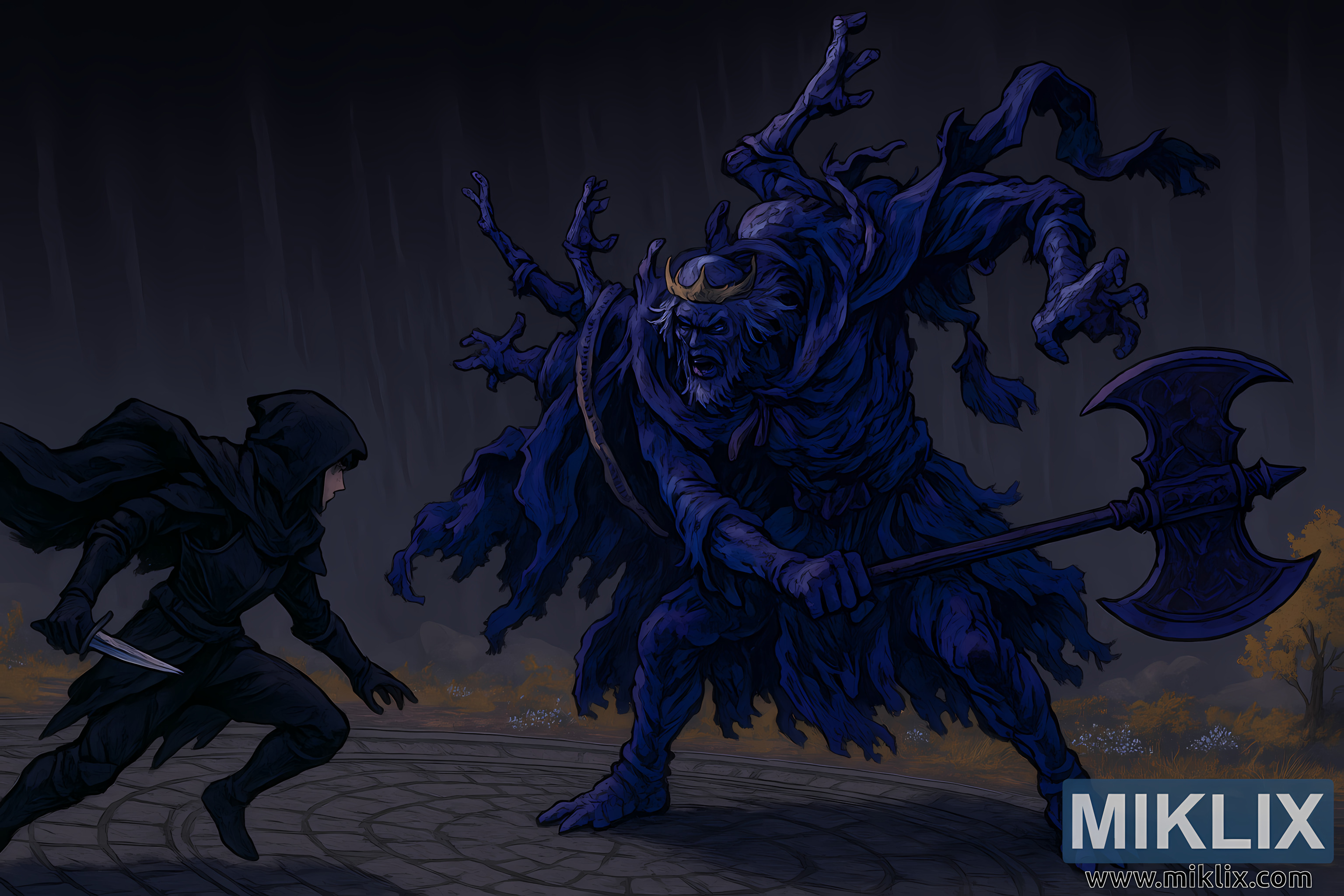 배경에는 드문드문 황금빛 풀과 낮은 초목이 돌 플랫폼을 둘러싸고 있으며, 멀리에는 은은하게 빛나는 황금빛 잎을 가진 나무가 보인다. 이 따뜻한 색감은 차갑고 밤의 분위기를 자아내는 전체적인 색채에 생기를 불어넣어, 황금 혈통을 관통하는 잃어버린 우아함과 몰락한 왕족이라는 주제를 미묘하게 떠올리게 한다. 전체적으로 이 일러스트는 충돌 직전의 멈춘 심장 박동을 포착하여, 움직임과 분위기, 그리고 이야기의 긴장감을 풍부하게 담아내며, 어두운 판타지와 표현력 넘치는 애니메이션 미학을 절묘하게 조화시킨다.